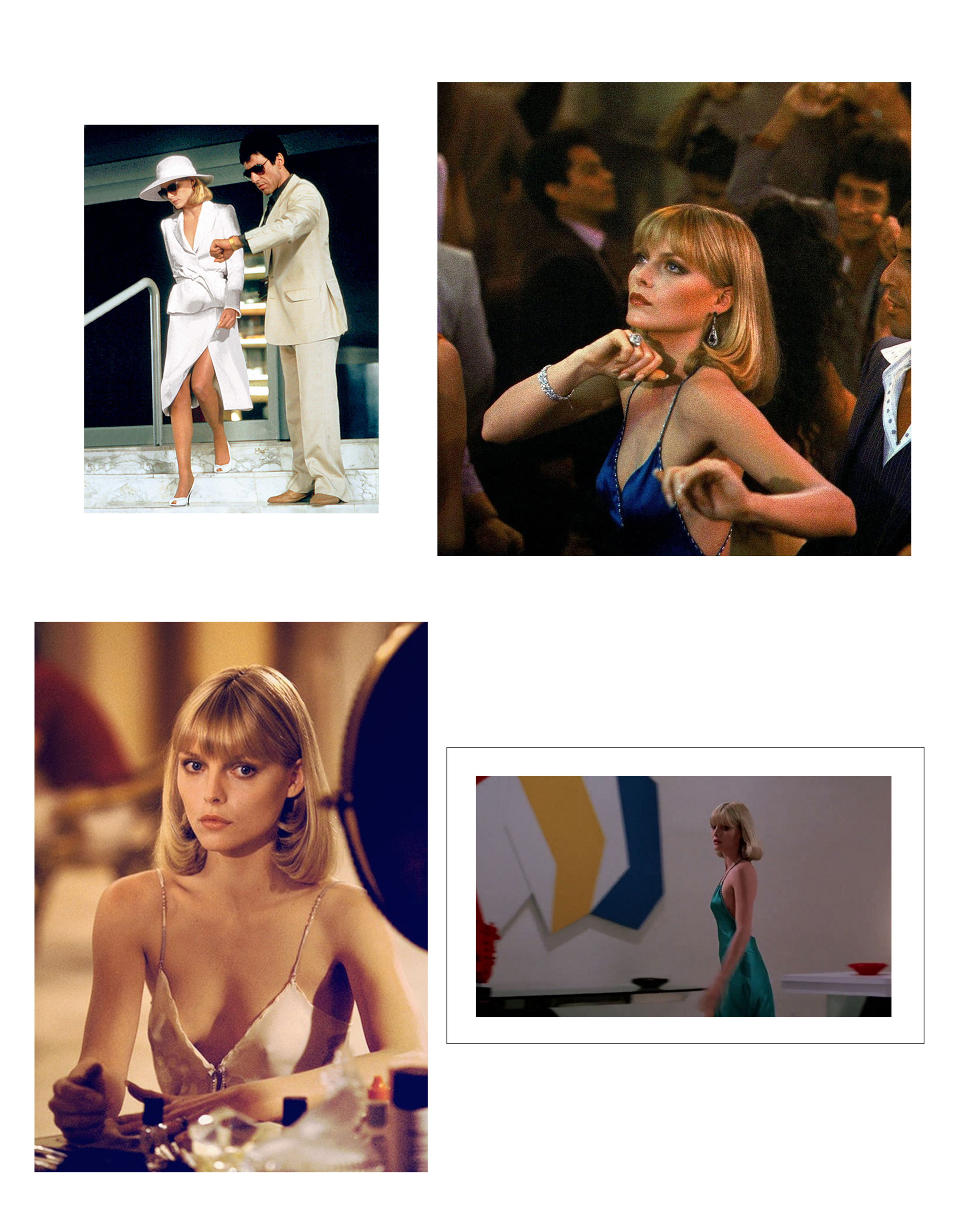 Одержимый желанием безраздельной власти и обладания всем, что принадлежит американским боссам, Тони уводит надменную красавицу и создаёт для неё свою золотую клетку. И если поначалу Эльвира еще появлялась в вещах вроде приглушенно-розового открытого платья или белоснежного костюма с широкополой шляпой для скачек, то в сценах совместной жизни с Тони её наряды становились всё более приближенными к образцам героинового шика 20-х.