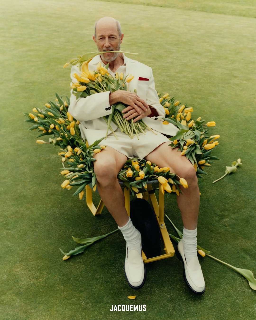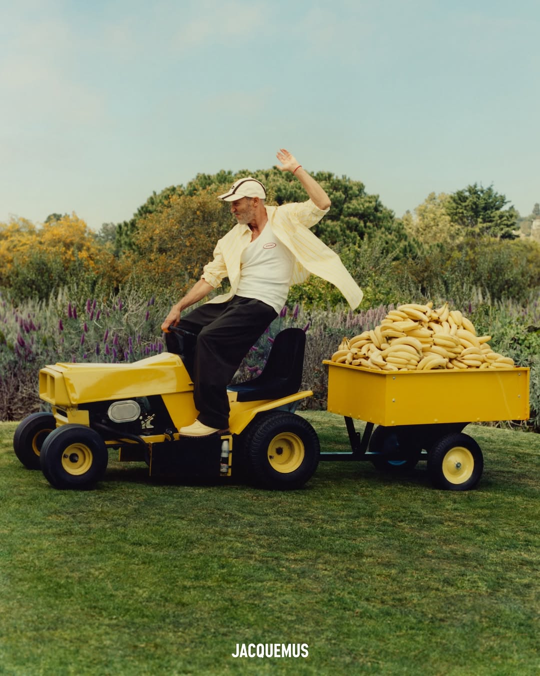 Темою нового кампейну Jacquemus, де знявся американський актор Джон Гріс («Білий лотос»), стало буквальне бананове божевілля. У серії знімків фотографа Ендрю Джейкоба знаменитість грає у гольф із фруктом, вирізає його форму в кущі, везе грона на тачці й просто «заявляє» з допомогою паперового гасла, що любить банани.