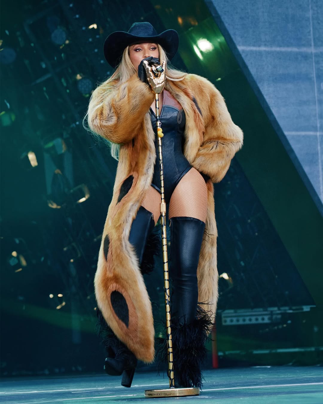 Змінюючи за один концерт кілька образів, Бейонсе вже встигла приміряти ансамблі Mugler, Loewe, Dolce&Gabbana, Schiaparelli, Burberry, Vivienne Westwood, Stella McCartney, серед багатьох інших. Більшість костюмів 35-разової переможниці «Ґреммі», які шанувальники вже побачили на ній, були кастомними й стали поєднанням естетики Дикого Заходу, концертного блиску та фірмових кодів модних марок. Ковбойські капелюх і чоботи, чапси, масивні пряжки, торочки — все це було всипано блискітками, підкреслюючи силует Queen B мерехтінням. А також — вирізнялося «модним масштабом».