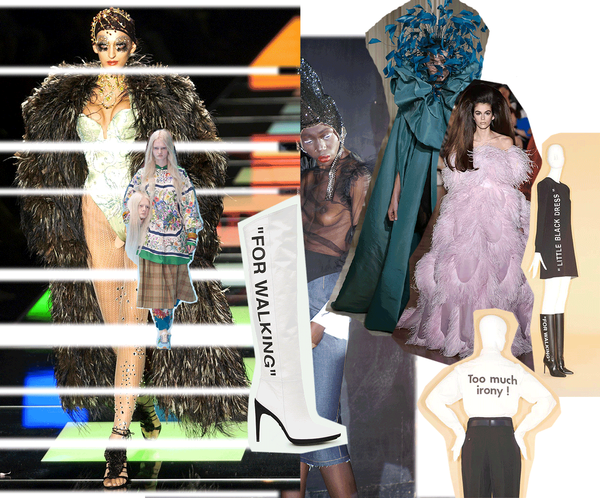 В моде кэмп в разное время проявлялся по-своему, обретая популярность то в виде легкомысленных и ярких девичьих нарядов 20-х годов, то в виде футуристических фантазий в коллекциях Paco Rabanne и Courregès 60-х. Сонтаг также причисляет к кэмпу балет “Лебединое озеро” и лампы Tiffany в стиле ар-деко, а доживи она до сегодняшнего дня – явно бы окрестила добрую половину дизайнеров адептами кэмпа. Театральные коллекции Джона Гальяно для Christian Dior начала нулевых – это был кэмп в своем ярчайшем проявлении, пример того, когда плохой вкус становится хорошим. 15 лет спустя на подиумах мы видим то же самое с точки зрения идеологии. Алессандро Микеле выпускает на показ моделей, которые держат в руках муляжи собственных голов. Демна Гвасалия заставляет весь мир забыть о классической эстетике и то побуждает одеваться как гопники постсоветских спальных районов, то доводит сочетания элементов гардероба до абсурда, а то и вовсе сшивает вместе легинсы и сапоги – почему бы и нет. Не отстает и Вирджил Абло: его бренд Off-White недавно стал самым популярным в мире, но вряд ли все его поклонники знают, что кавычки в ироничных надписях на сапогах For Walking или надпись “Маленькое черное платье” на, сюрприз-сюрприз, маленьком черном платье – это 100% кэмп, который любит и кавычки, и иронию, и напрочь отрицает серьезность.