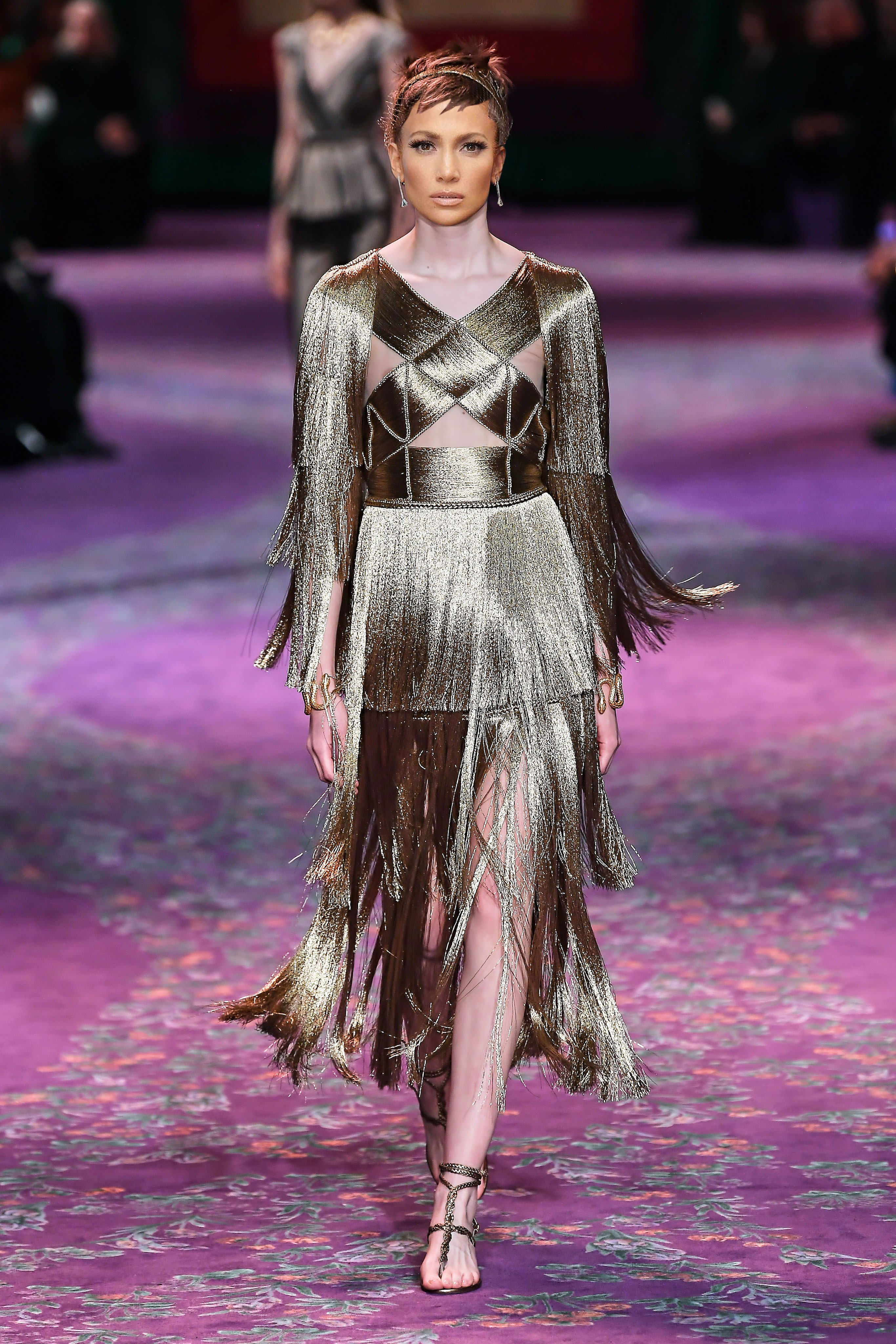 Платье из сверкающей бахромы от Сhristian Dior, авторства Марии Грации Кьюри — символ женственности, силы и зажигательного темперамента. Дженнифер Лопес порой напоминает спустившуюся с небес языческую богиню, так что долго думать над нарядом не приходится. Суперженщине всегда к лицу золото.