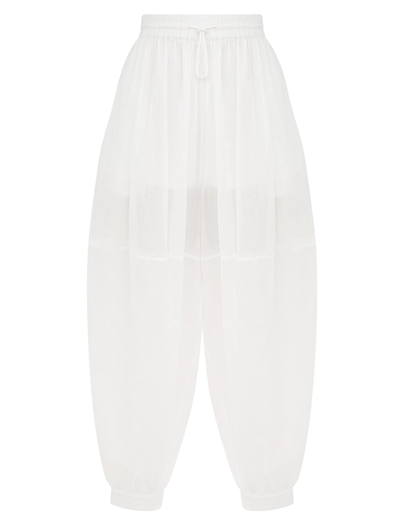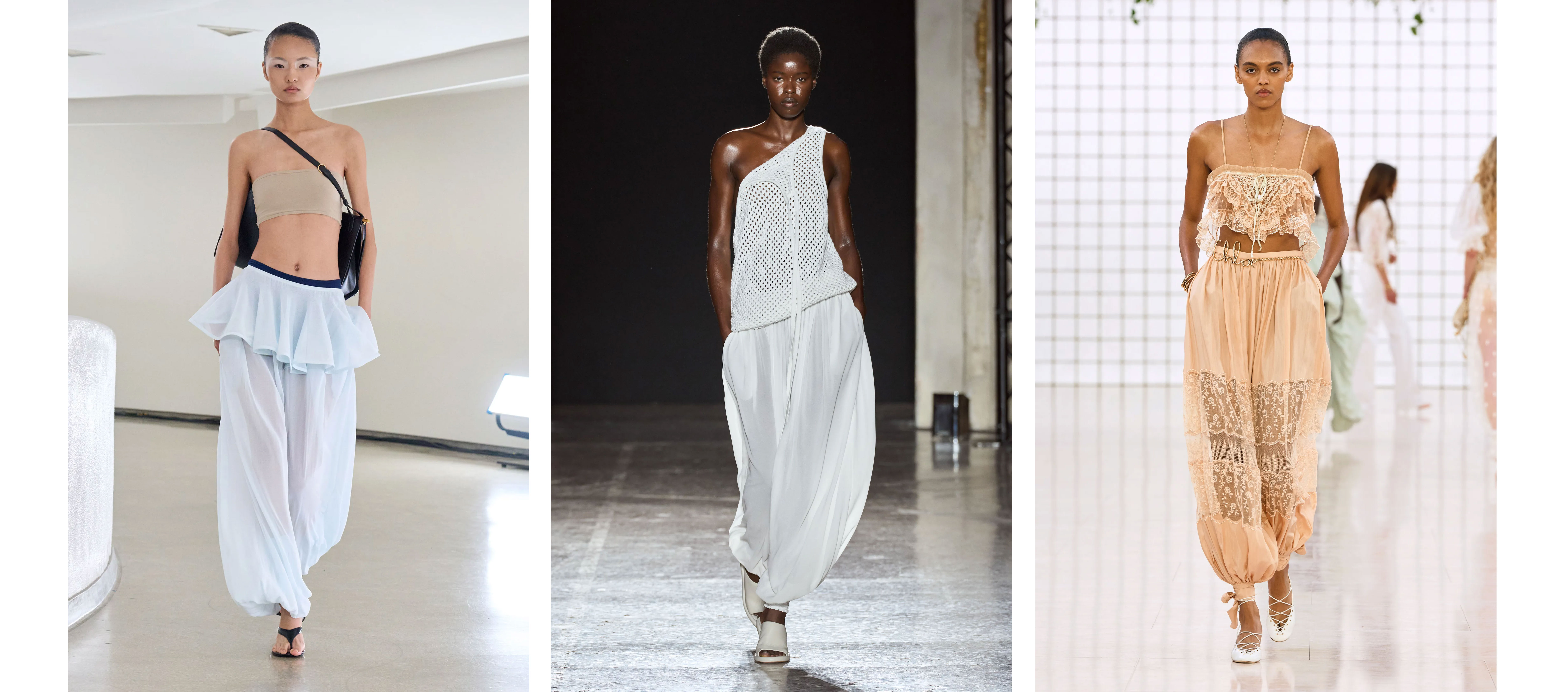 На подіумах сезону весна-літо 2025 така модель з’явилася в провідних фешн-гравців, стаючи натхненням для особистих стилізацій. У Chloé її показали в ніжному ансамблі в парі з мереживним топом на тонких бретелях й скомбіновану зі шнурованим взуттям на невисоких підборах. В Alaïa прозорі гаремні штани з декоративною баскою парували з тілесним топом-бандо й сумкою крос-боді. Зі свого боку Andreadamo зробили ставку на комбінацію з сітчастим топом на одне плече.