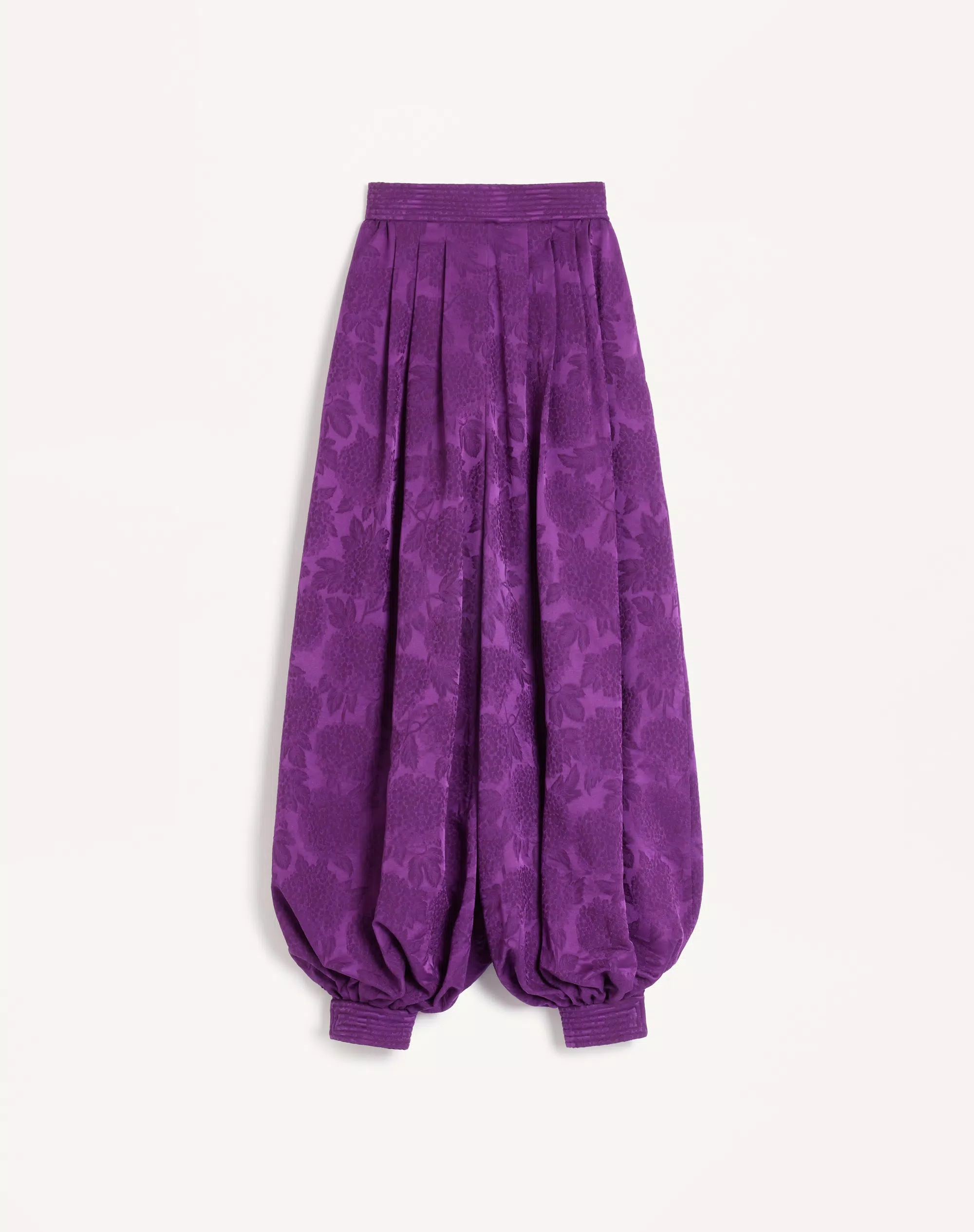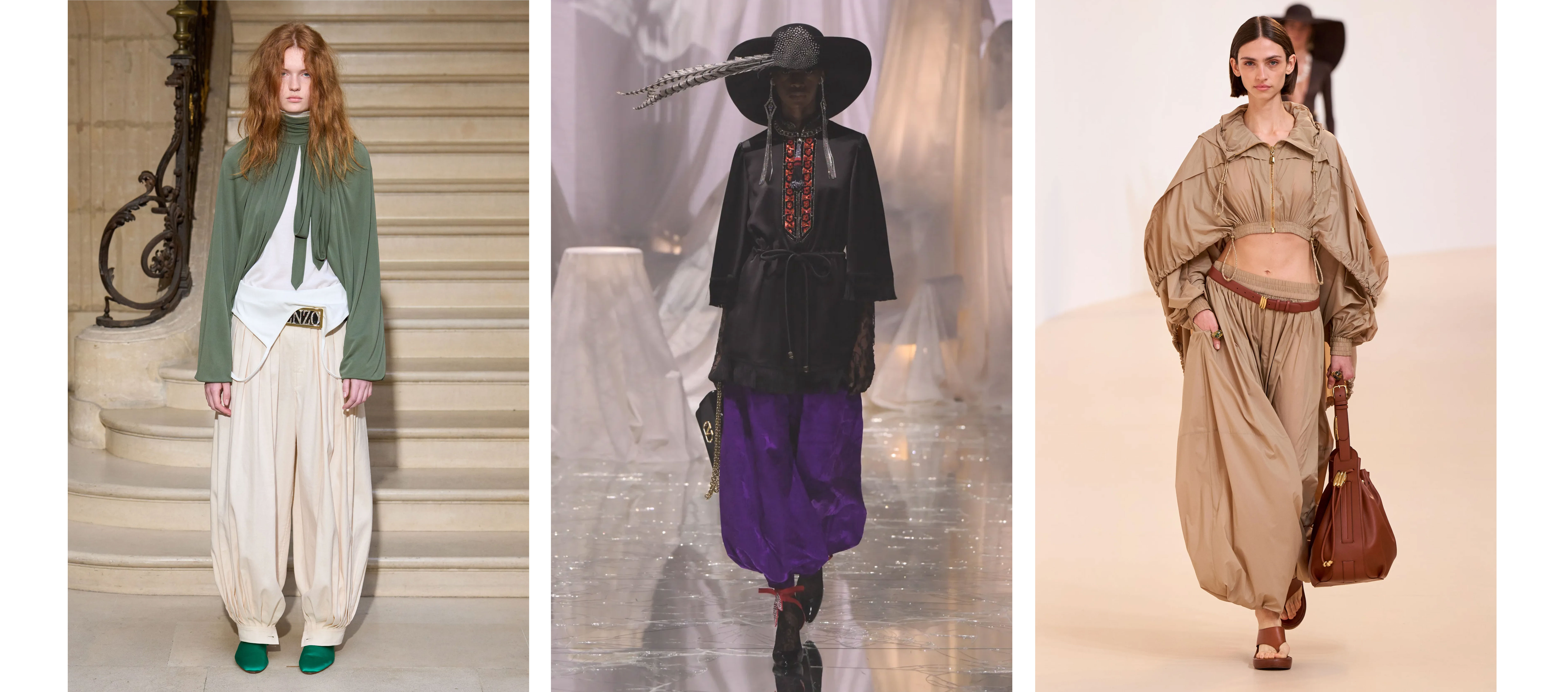 Більш еклектичну й ошатну стилізацію з фіолетовими гаремними штанами продемонстрували у Valentino. Заразом Zimmerman проілюстрували: ця річ, створена в більш мішкуватому, «парашутному» напрямі, може з легкістю стати частиною образу у вуличному стилі. Kenzo ж пропонують розглянути актуальність «низу Аладдіна» вже у сезоні осінь-зима 2025/2026, поєднуючи його із зеленим драпірованим та білим верхом, акцентним взуттям і широким ременем.