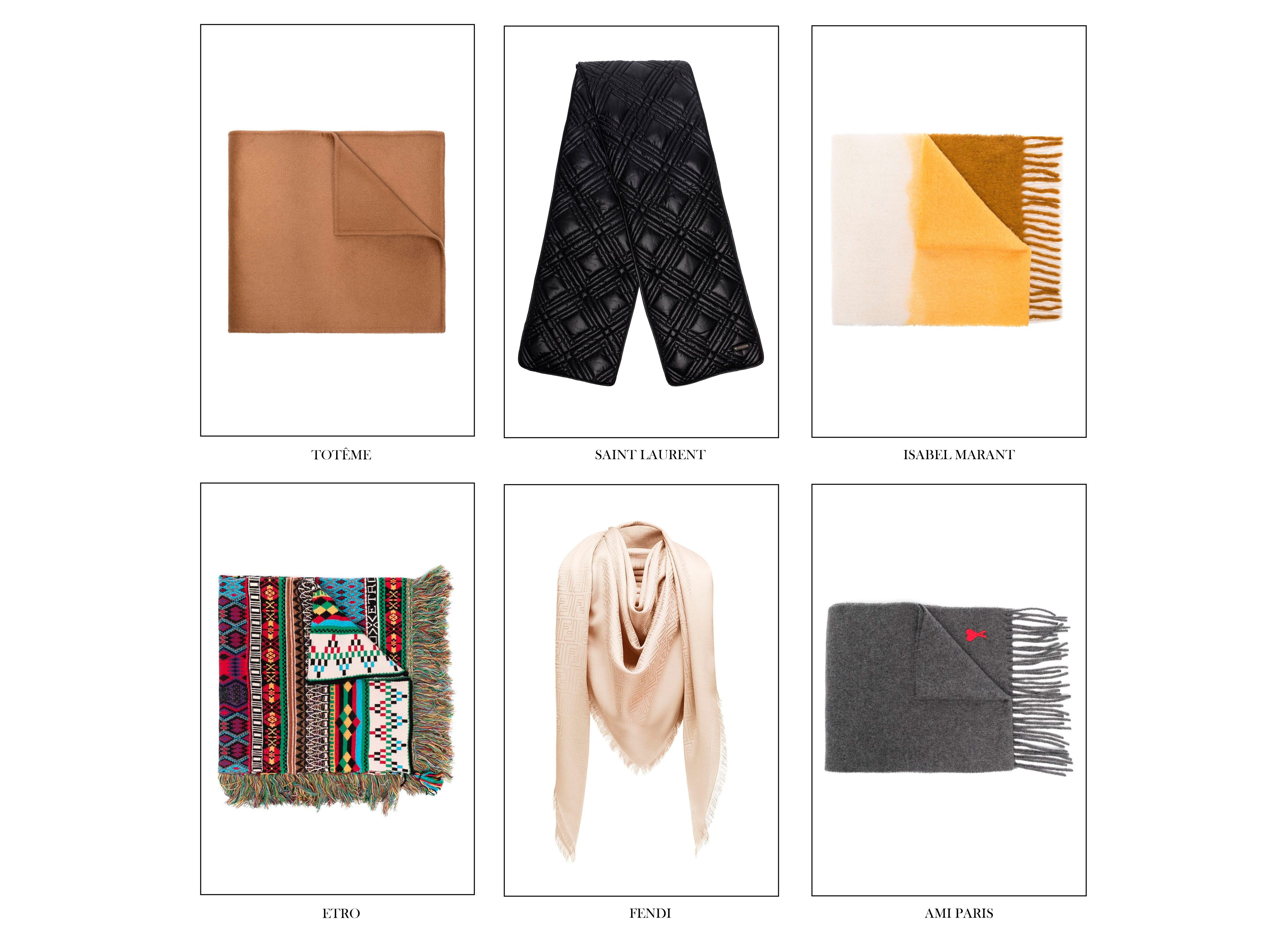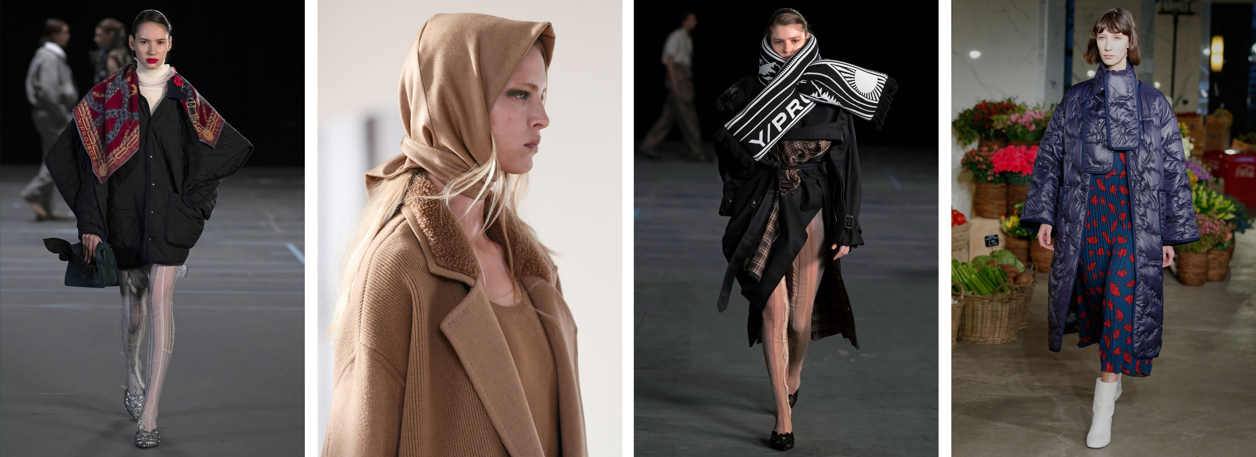 Миучча Прада снабдила моделей на своем снежном шоу Miu Miu цветными шарфами крупной вязки, напоминающими аксессуары для винтажных кукол и других игрушек, Boss предлагают утепляться с помощью длинного шерстяного шарфа, мягко обернутого вокруг шеи и закинутого за плечо, а Y/Project повязывают огромным узлом брендированное полотно. Max Mara следуют традициям элегантности и показывают, как носить кашемировый шарф на голове, дополняя классическое бежевое пальто. На осеннем показе Jason Wu модели выходили в стеганых шарфах. За ними подобные шарфы появились и у Saint Laurent.
