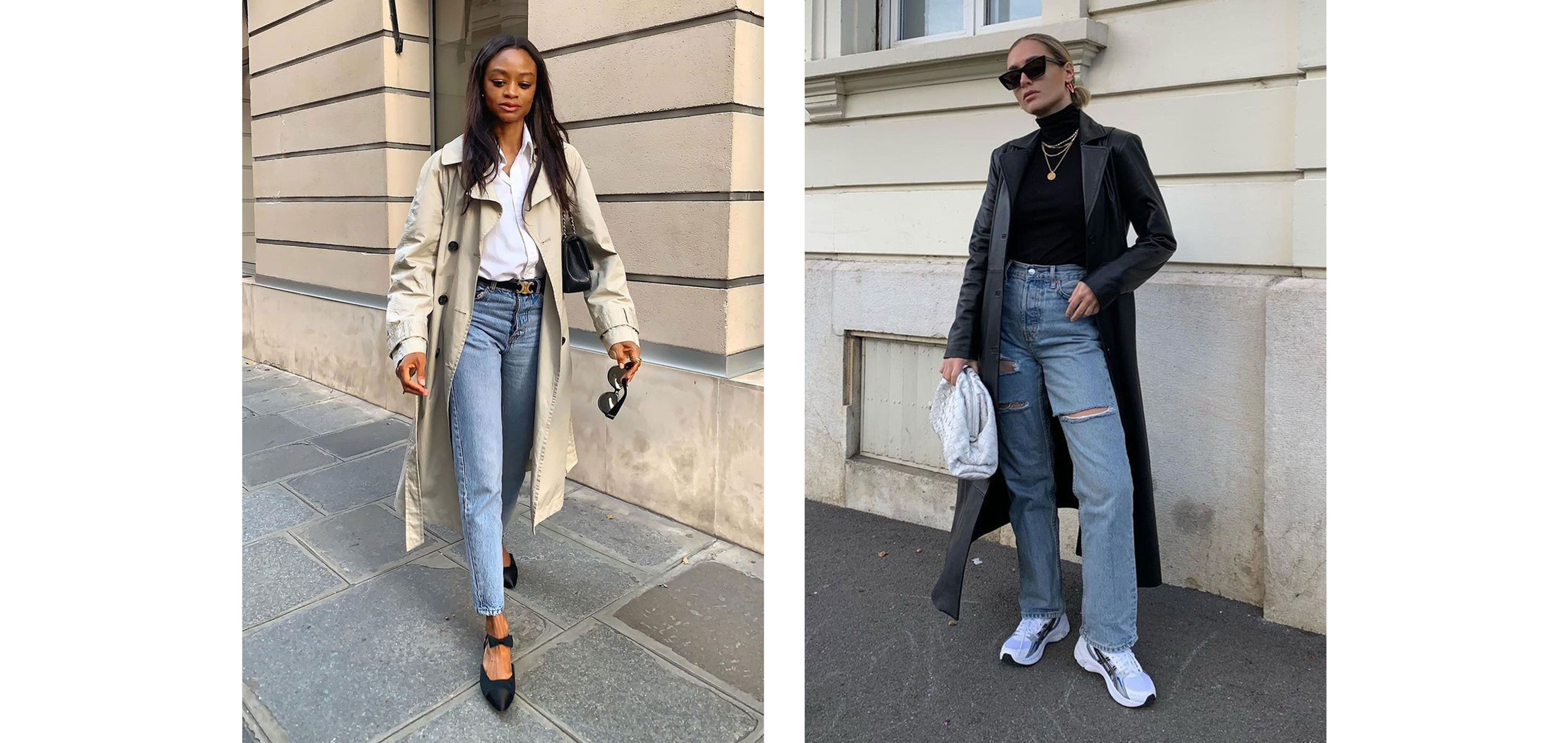 Лучше всего с mom-джинсами сочетаются массивные дубленки, джинсовые куртки и пальто. В ход также могут идти тренчи, однако их крой должен быть прямым, иначе возникает риск утяжелить нижнюю часть силуэта. Необычный ход — дополнить джинсы прямой кожаной курткой или объемным костюмным пиджаком.