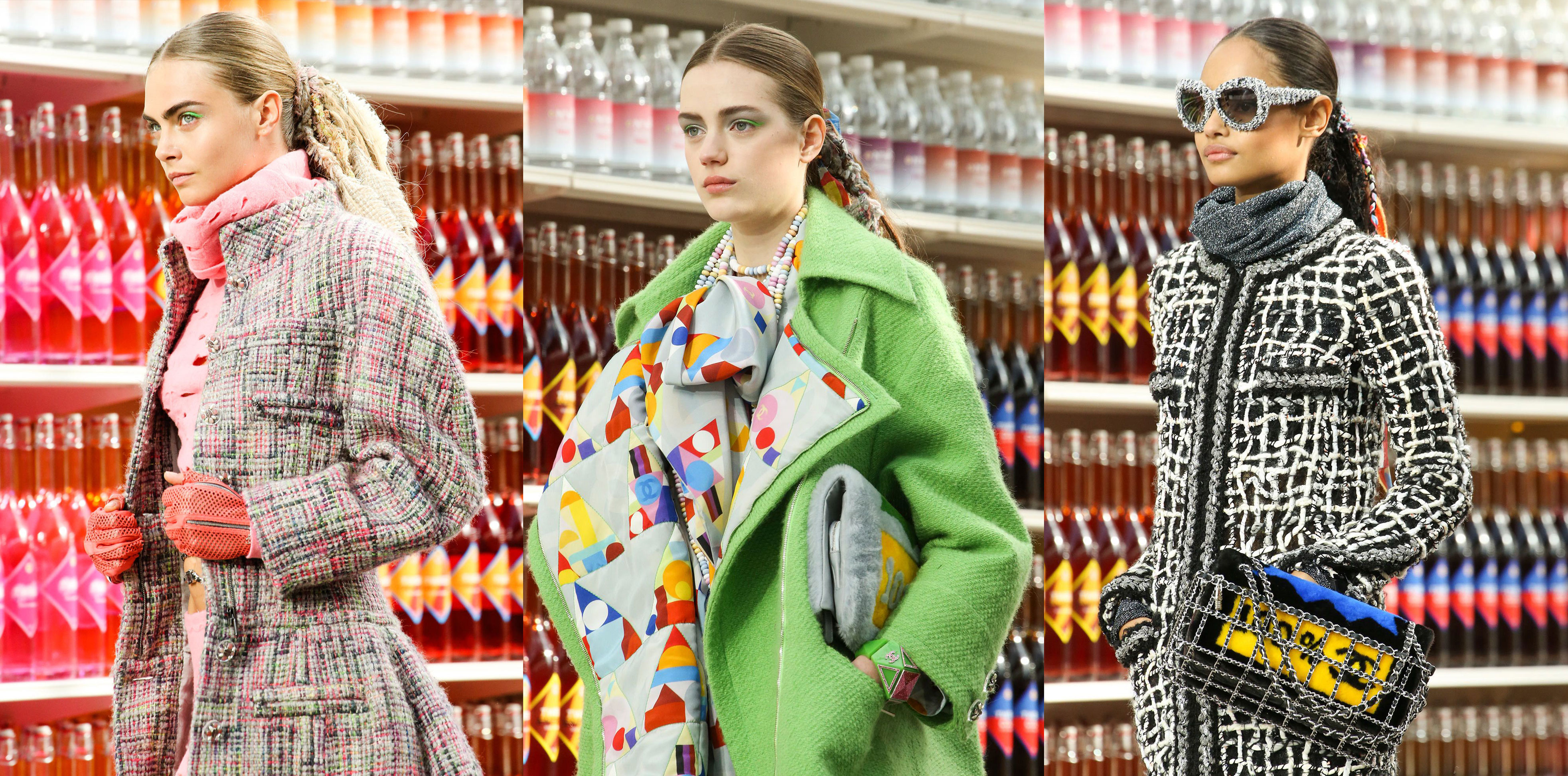 7 лет назад мы узнали, что модный показ может проходить даже в супермаркете. Шопинг-центр Chanel был выстроен специально для шоу, однако выходка удалась! Модели прогуливались в жизнерадостно ярких пальто, блузах и костюмах среди полок с водой, сидром, овощами и конфетами, будто решили купить продуктов к праздничному столу.