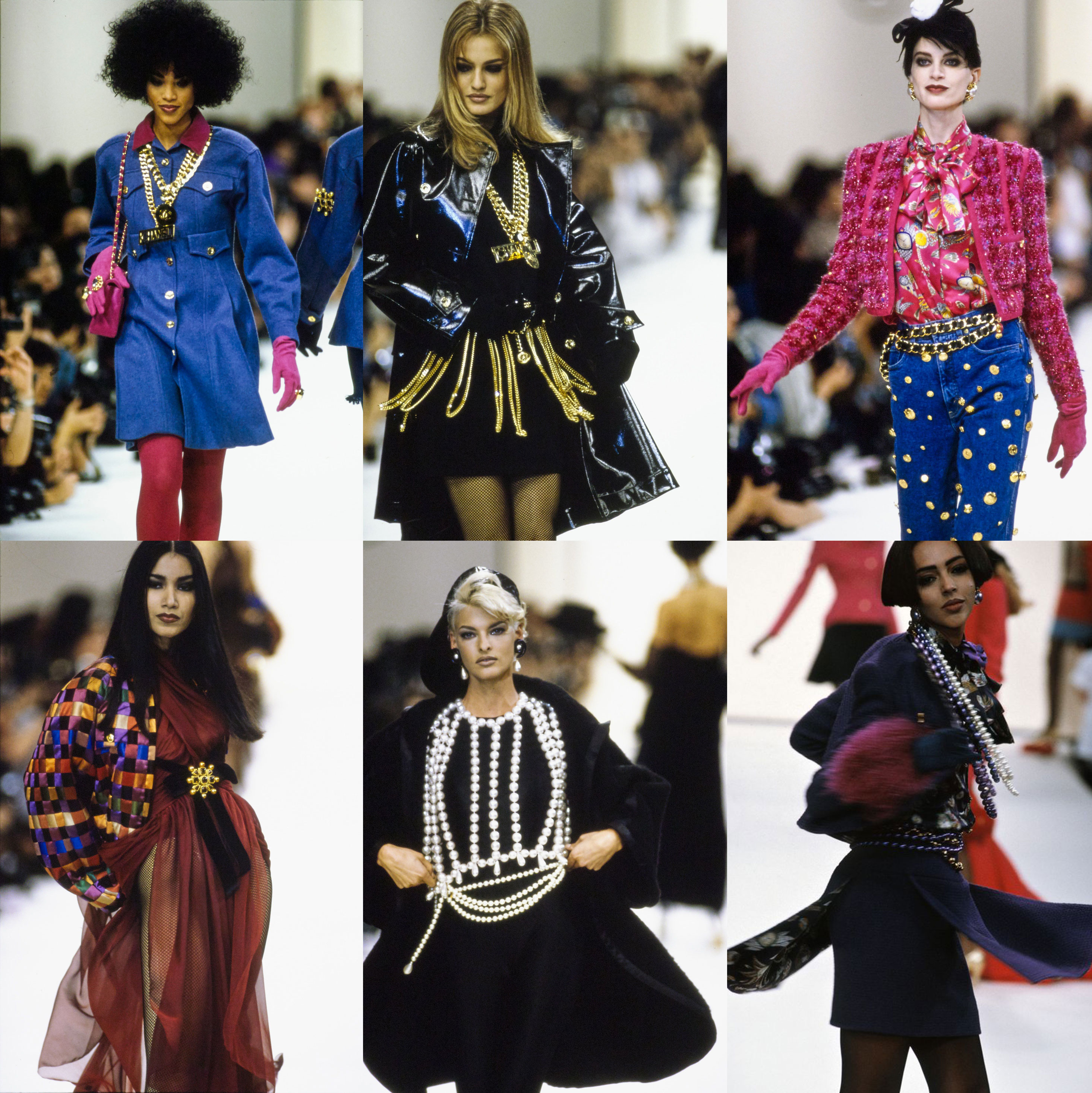 Жемчужная броня Линды Евангелисты и сегодня может быть актуальным вечерним аксессуаром, дополнив как уютный джемпер, вторя самому показу, так и роскошное шелковое платье в голливудском духе. От наслоения золотых цепей в образе Карен Малдер и вовсе сложно отвести взгляд. А ещё в тот период Карлу гениально удавалось одно из любимых сочетаний небесно-синего денима и вещей оттенка фуксии.