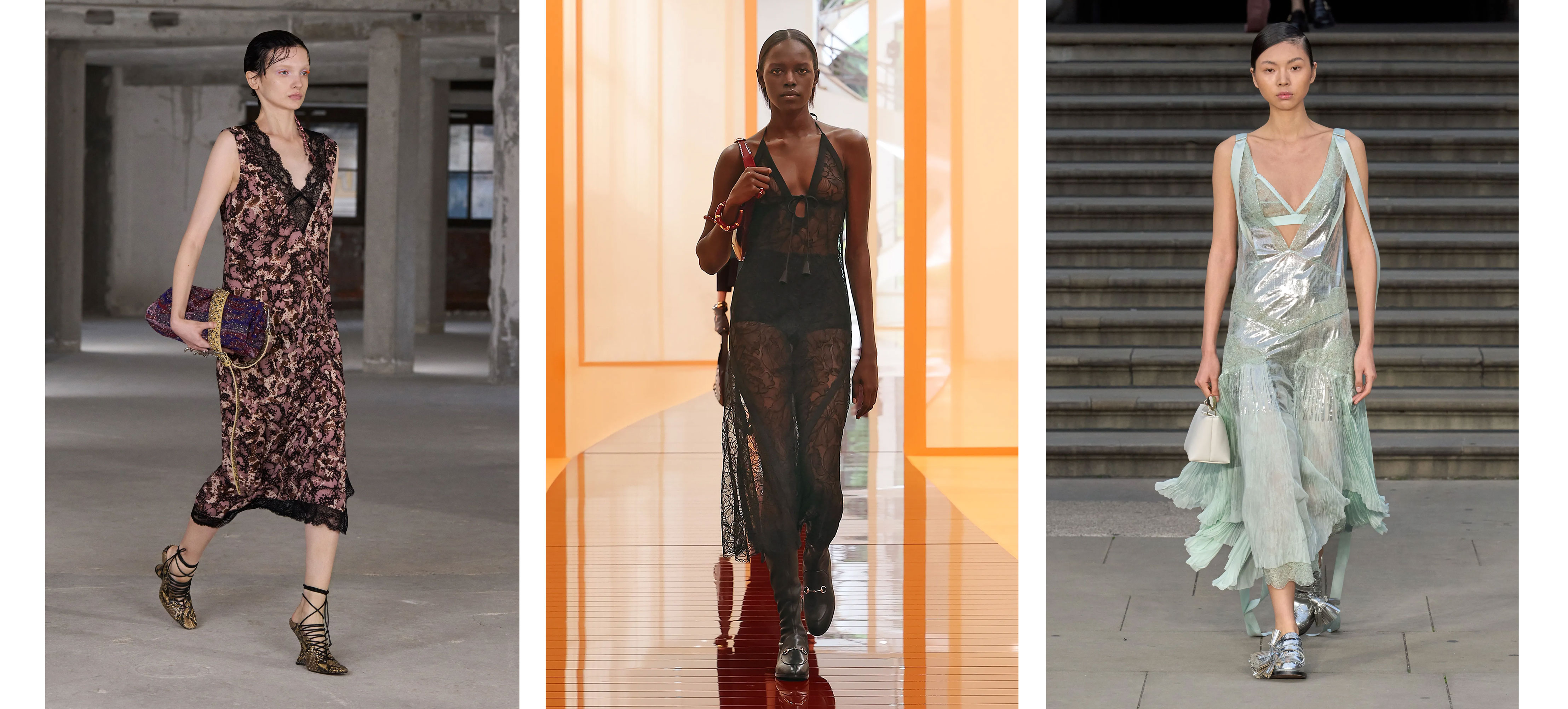 Ефектна мереживна сукня також з’явилася в Dries Van Noten, вирізняючись акцентним принтом і поєднанням із не менш ефектними блискучою сумкою та «зміїними» мюлями. Продовжує парад візуальної виразності образ Erdem — тут ніжність римується з гламурністю металіку. Що ж до Gucci, то Дім пропонує напівпрозору чорну мереживну сукню, скомбіновану з червоною лакованою сумкою й чоботами-лоферами.