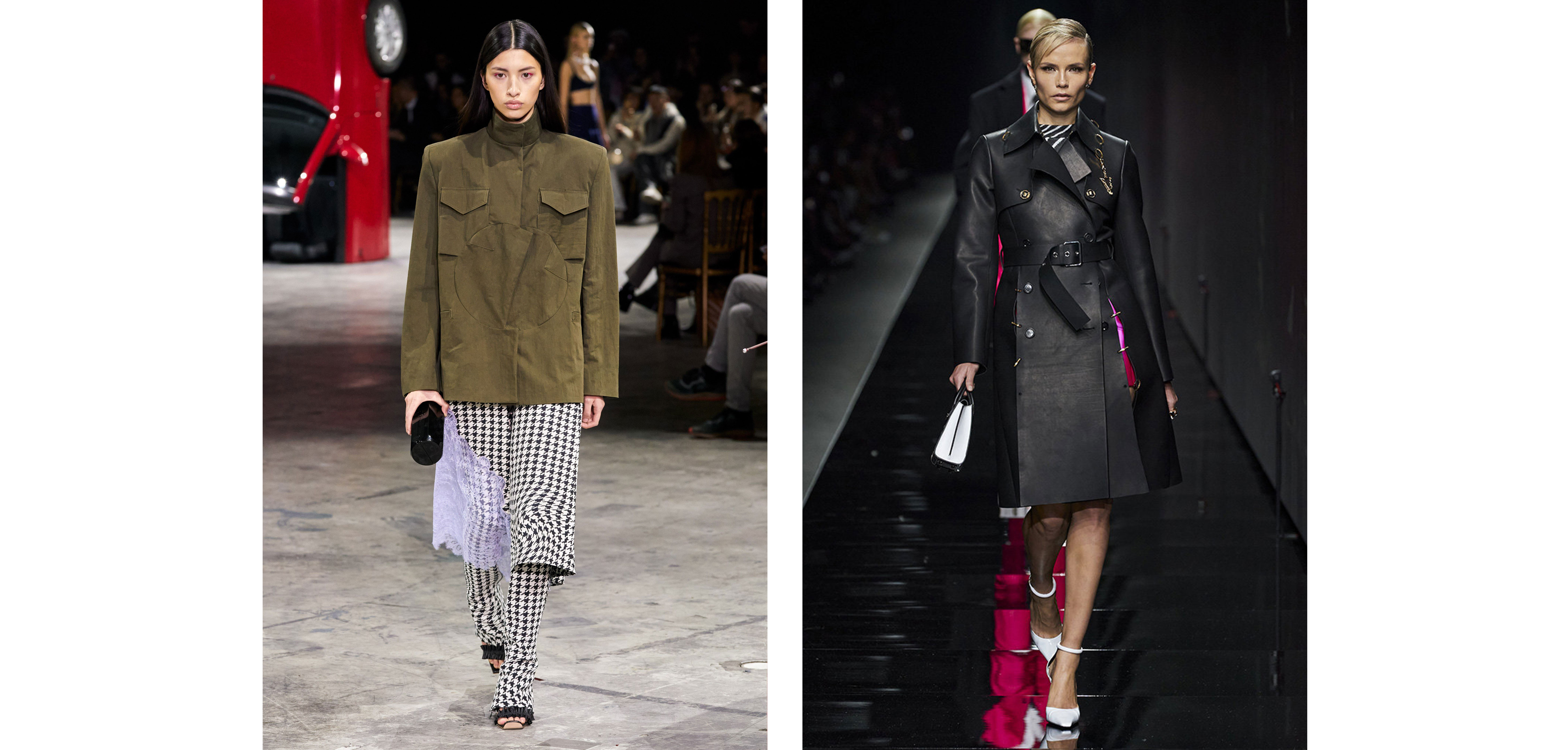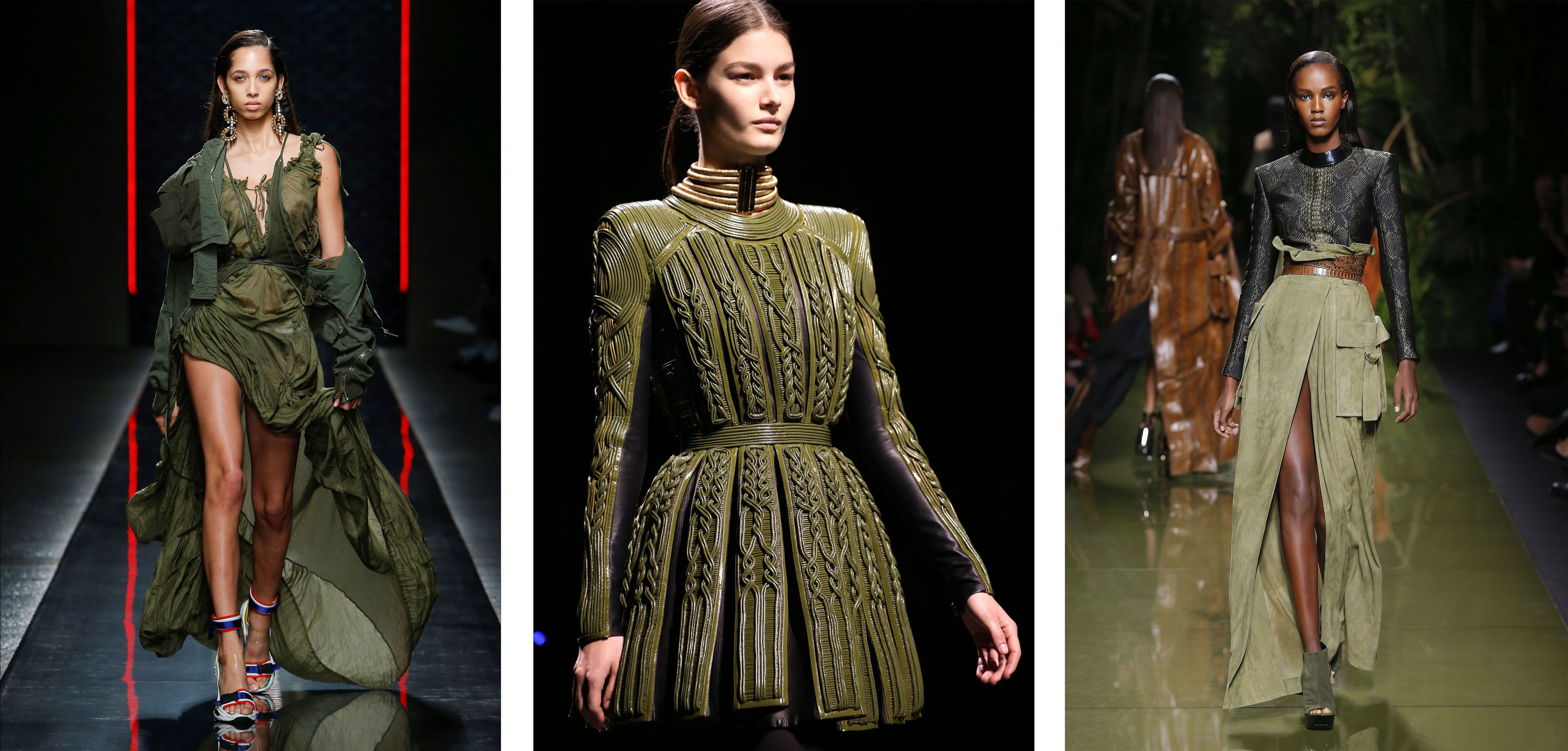 Пожалуй, единственный атрибут военной моды, который дизайнеры обходят стороной, — это грузные юбки миди из 40-х. Даже взяв на себя смелость работы с таким силуэтом, креативные директора модных домов предпочитают корректировать их. В целом же платья в стиле милитари почти всегда являются свободной фантазией автора. Это и присобранные "парашютные" наряды, как у Off-White, и будто сшитые вместе отрезы брезентовой палатки, как у Balmain или Sacai. В коллекциях также встречаются вечерние наряды, собранные из сотен армейских шнурков, или монолитные кожаные платья со строгими воротами. Главное условие — защитная палитра и отсутствие нарочито гламурного декора. Струящиеся силуэты, рюши, легкие фактуры не впишутся в стиль милитари.