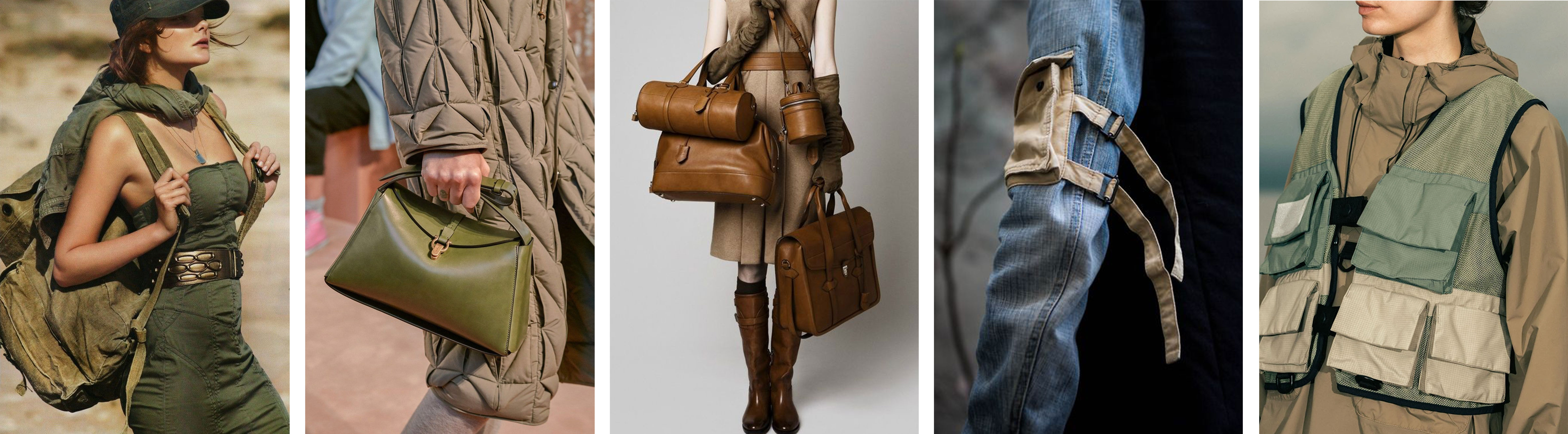 Аксессуары в военном стиле прежде всего содержат в себе идею практичности и многофункциональности, а иногда — идентификации. Так, универсальные пояса со множеством карманов, шевроны, металлические жетоны, "разгрузы" и вместительные рюкзаки из брезентовой ткани пользуются большим успехом у ценителей милитари. Однако в этой истории всегда было место для элегантности и лоска. Так, пеналы, тубусы и ручные сумки наподобие чемоданов для снаряжения из кожи встречаются в коллекциях известных Домов моды: например, Ermanno Scervino, Hermès, Salvatore Ferragamo и других.