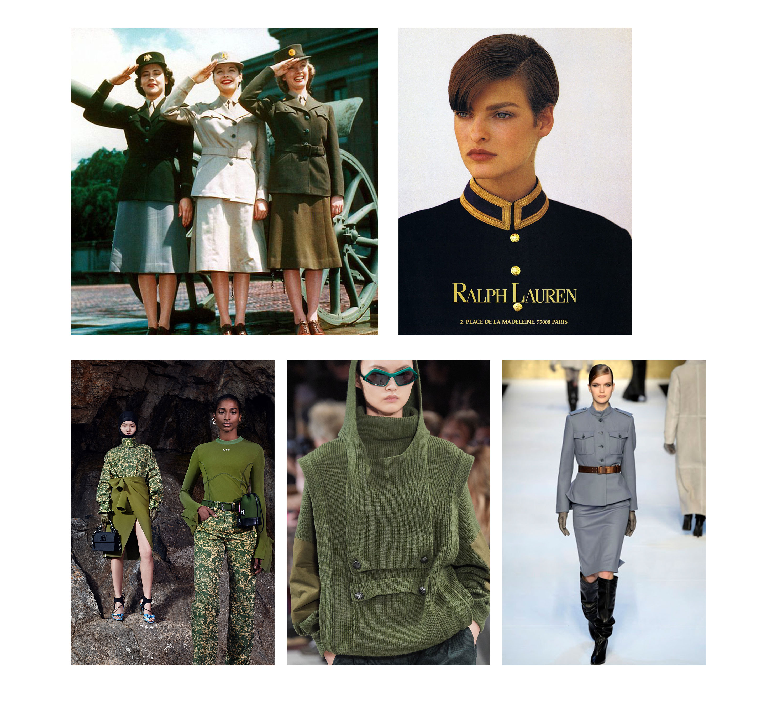 Десятки фильмов о ловких военных, растущая популярность боевых секций — всё это также способствовало развитию военной моды на защитные цвета, офицерские пояса, камуфляж и пустынные брюки. А виной всему стали британские солдаты начала 20 века, чья яркая форма затрудняла тактику боя в ходе Первой мировой, так что армии пришлось изобрести более хитрую одежду. Так появилась форма защитных цветов, которая и определила дальнейшее развитие военного стиля.