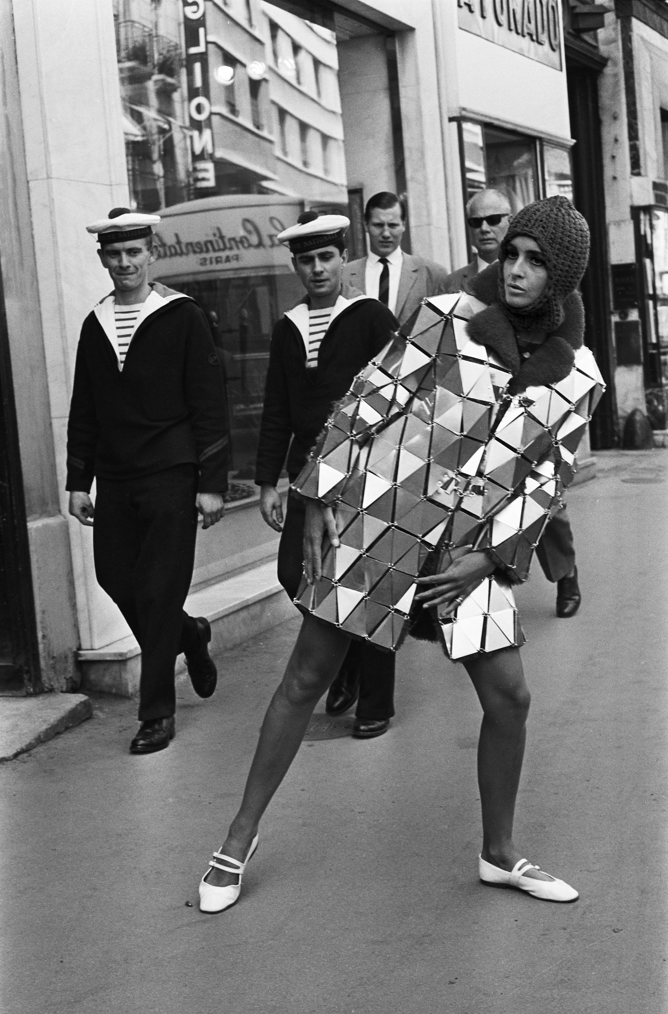 Дзеркальні площини, розташовані таким чином, щоб створювати скульптурну гру форми і світла, Пако Рабан використовував не тільки в 60-х, а й протягом 80-х. Ромбоподібні пластини, що складаються завдяки граням, які збігаються, стали ще однією візитною карткою бренду Paco Rabanne. А ще такий прийом був дуже популярний у 2000-х і 2010-х, коли дизайнер Іссей Міяке випустив пластичні сумки з пластикових трикутників. Однак через масове виробництво і копіювання мало хто знав, де лежать витоки цього стилістичного рішення.