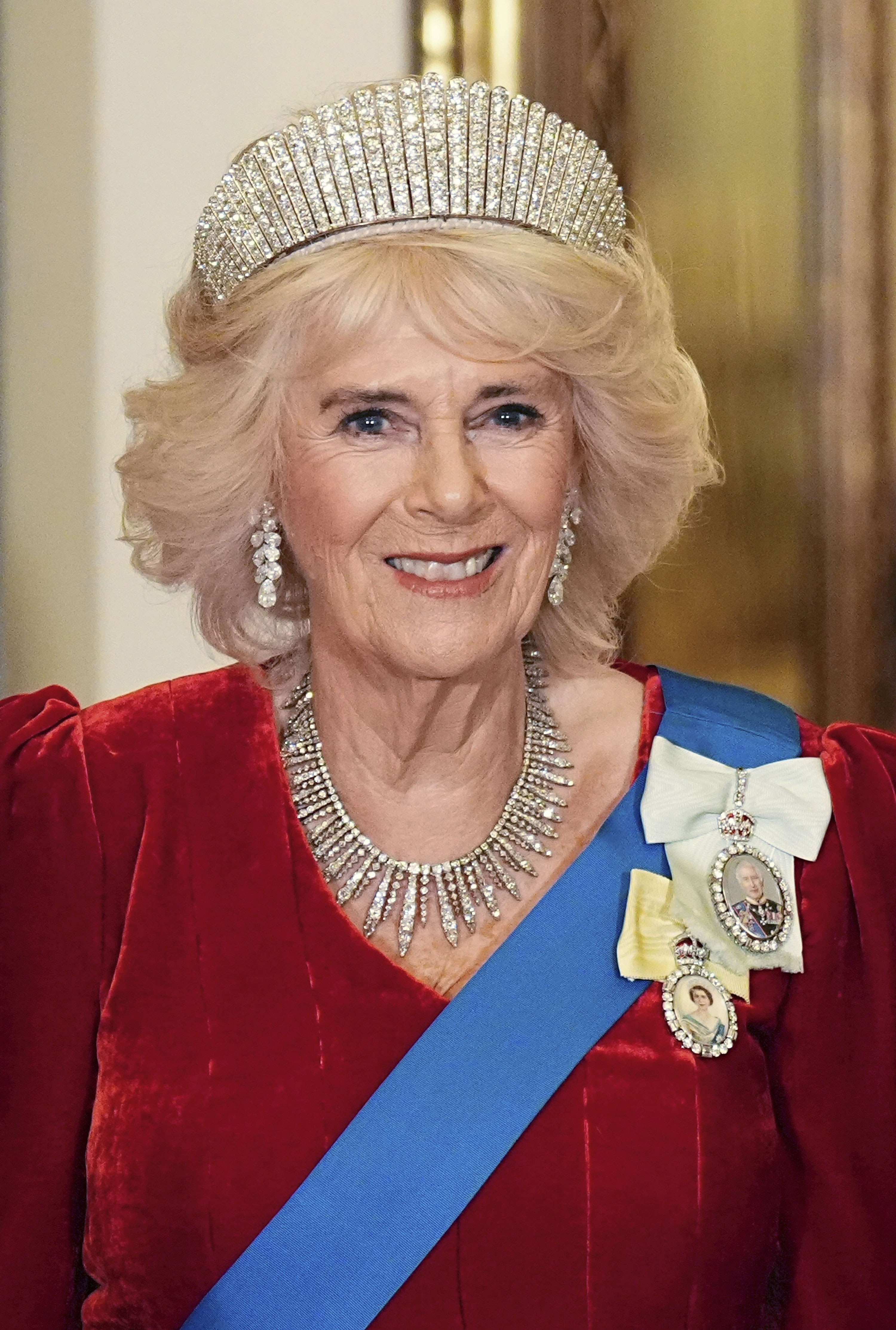 Діамантову тіару, яку Каміла успадкувала від Єлизавети II, королева-консорт доповнює кольє в тому ж стилі. Востаннє набір дружина короля Чарльза вдягала в 2024-му році — на державному банкеті, де її образ підкреслювали чутливі деталі — броші з портретами чоловіка та Її Величності.