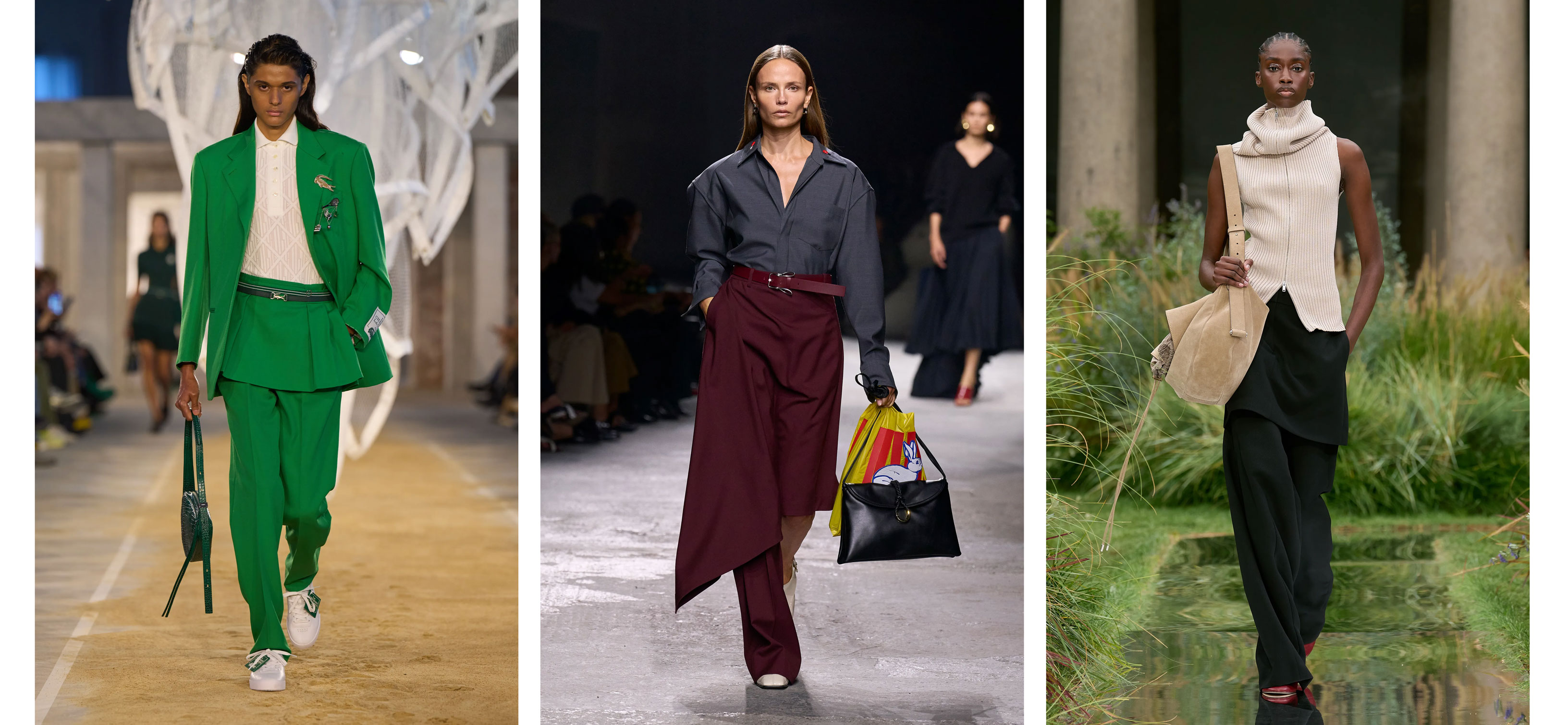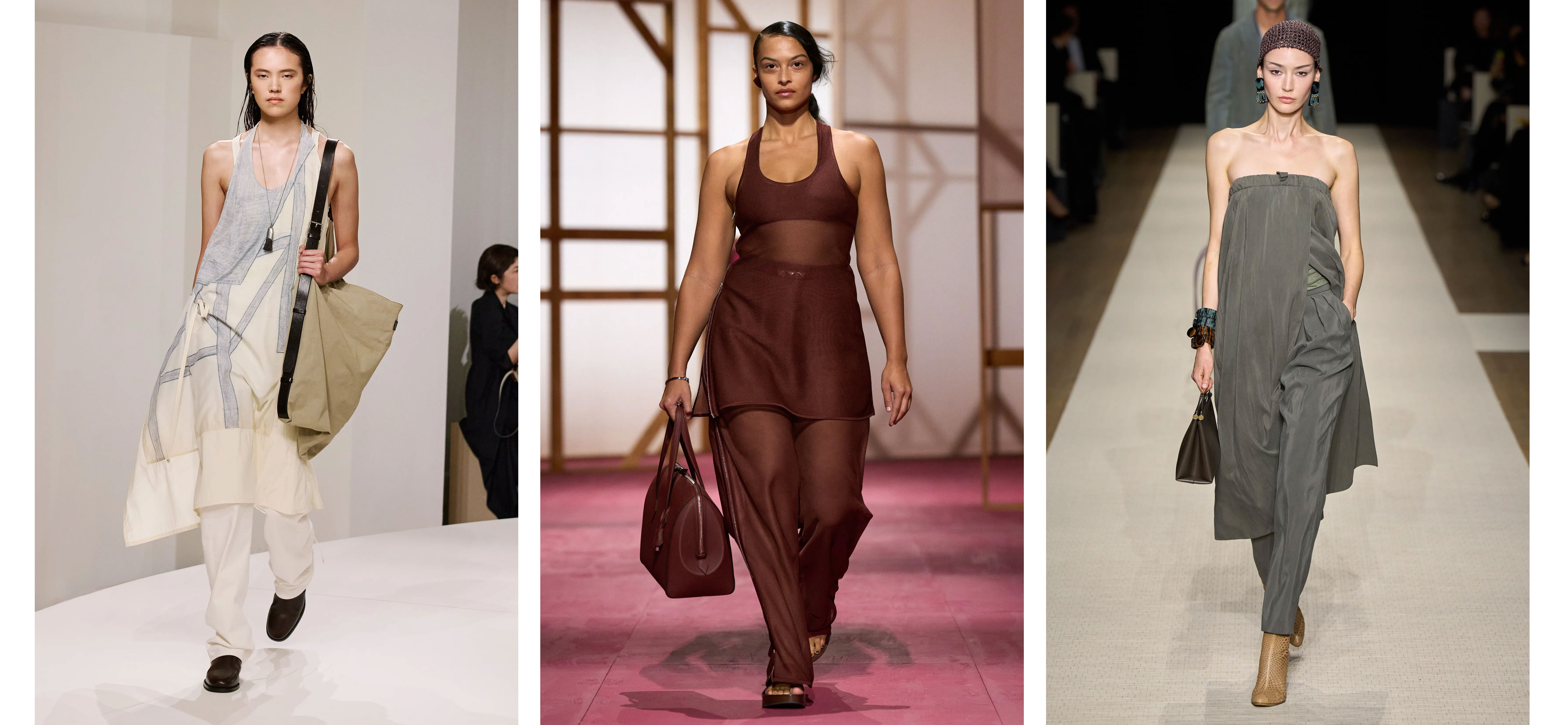 Як бачимо, подіумні стилізації спідниць та суконь поверх штанів тяжіють до монохромності, єднальної палітри у всіх або більшості речах. Це також стосується продемонстрованого напівпрозорого ансамблю Hermès і того, що представили в Giorgio Armani, де балансували між легкістю й строгістю. Дотрималися такого напряму і в Lemaire, удосконалюючи образ з аксесуарами: підвіскою та масивною сумкою.
