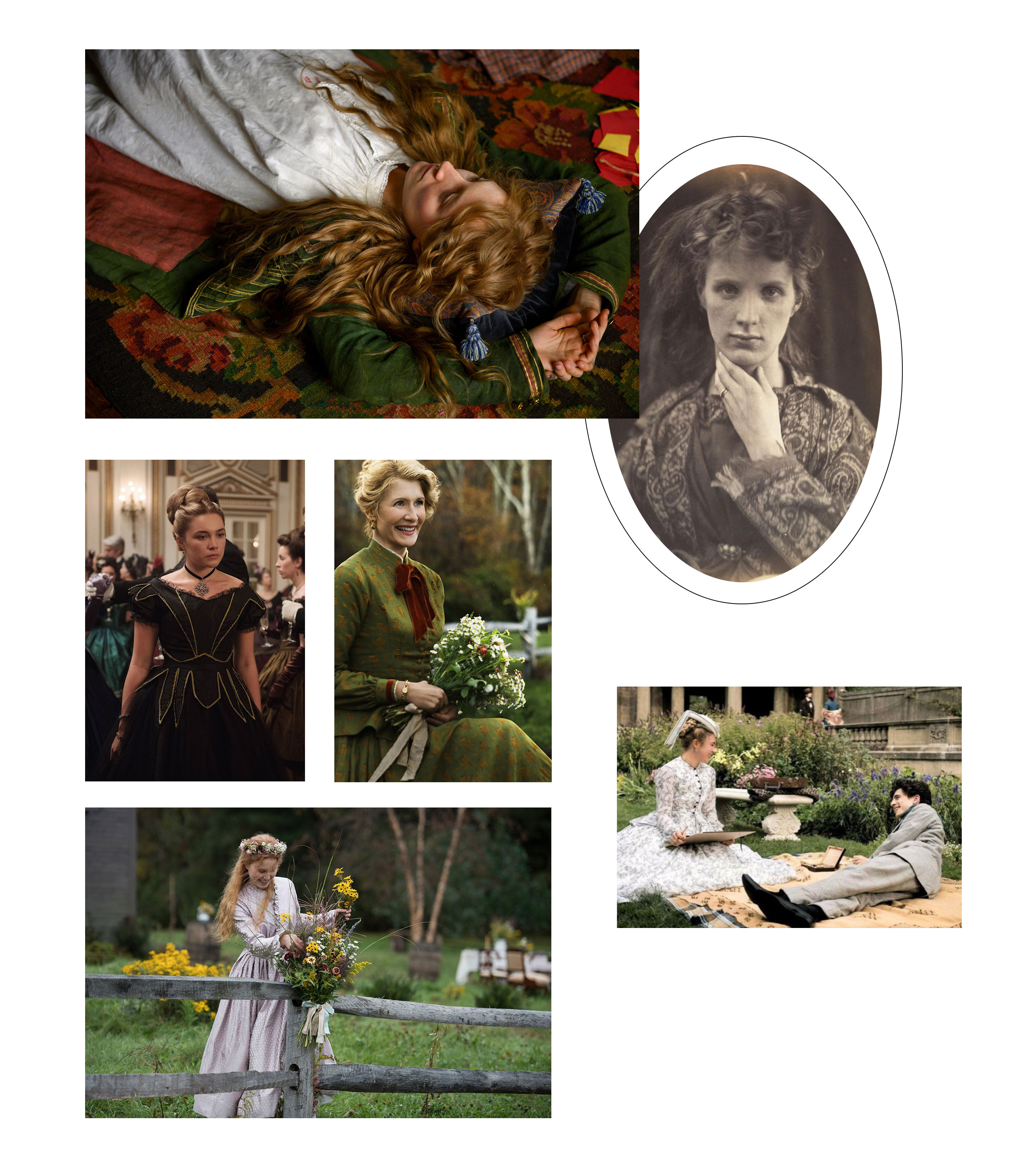 Свадебный наряд Мэг с венком из цветов и зеленое, похожее на рыцарский кафтан, пальто Джо вызывают прямые ассоциации с персонажами картин прерафаэлитов. Стиль Эми в большей степени отсылает к полотнам импрессионистов, особенно в период её пребывания в Париже вместе с тётушкой.