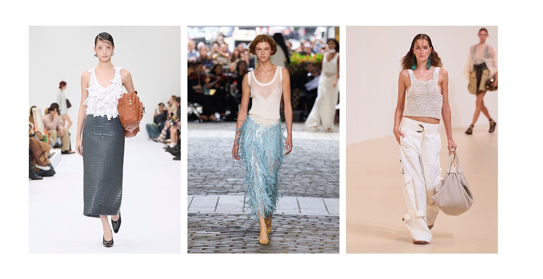 Зліва направо: Tory Burch весна-літо 2025, Stella McCartney весна-літо 2025, Gabriela Hearst весна-літо 2025