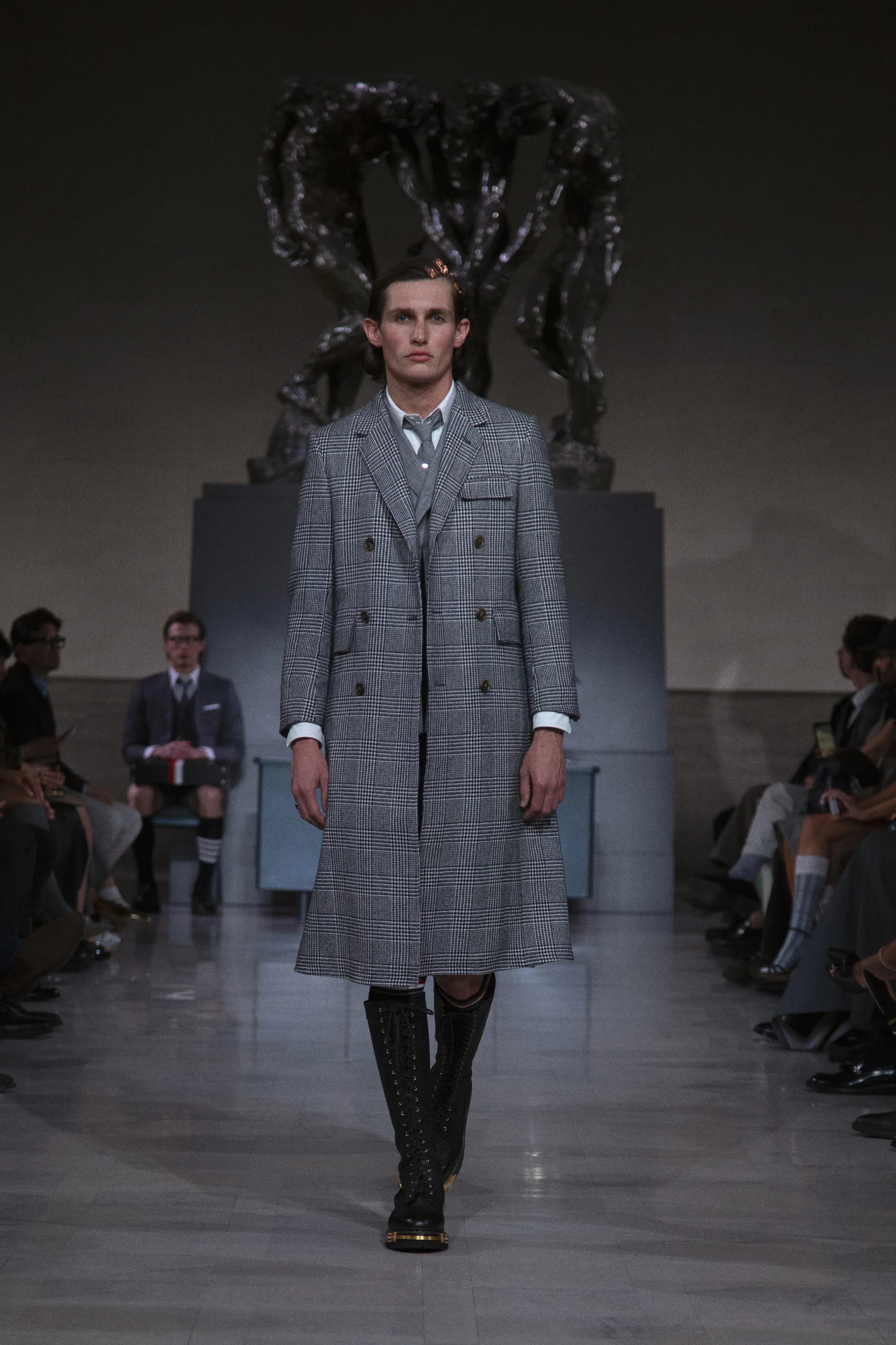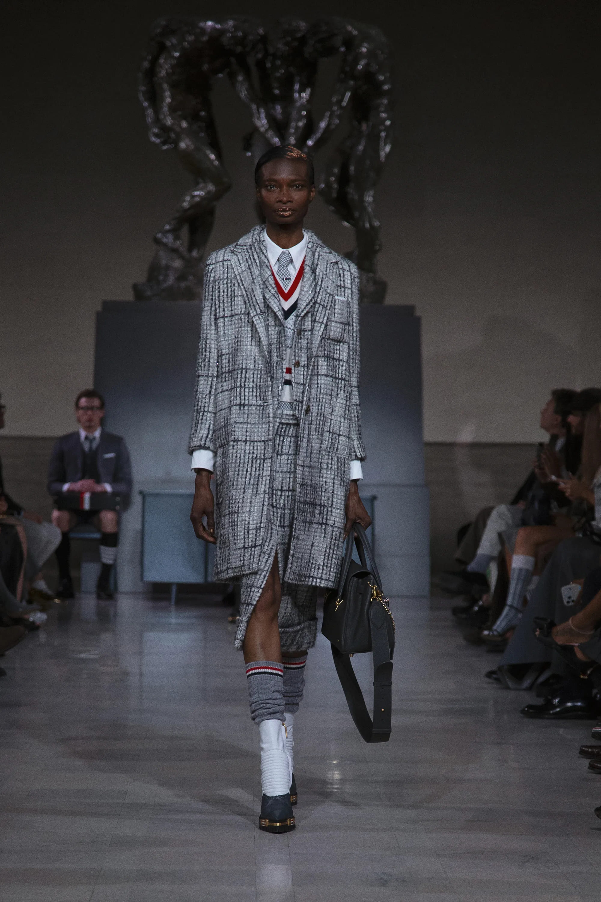У центрі колекції сезону fall-winter – 2026 — рефлексія над модною практикою довжиною у чверть століття. Тут Том Браун повертається до витоків: класичного костюма, точних пропорцій і діалогу між кравецькою традицією та спортивним одягом. Головним відтінком колекції був обраний сірий – знаковий колір, який нерозривно асоціюється з американським брендом.