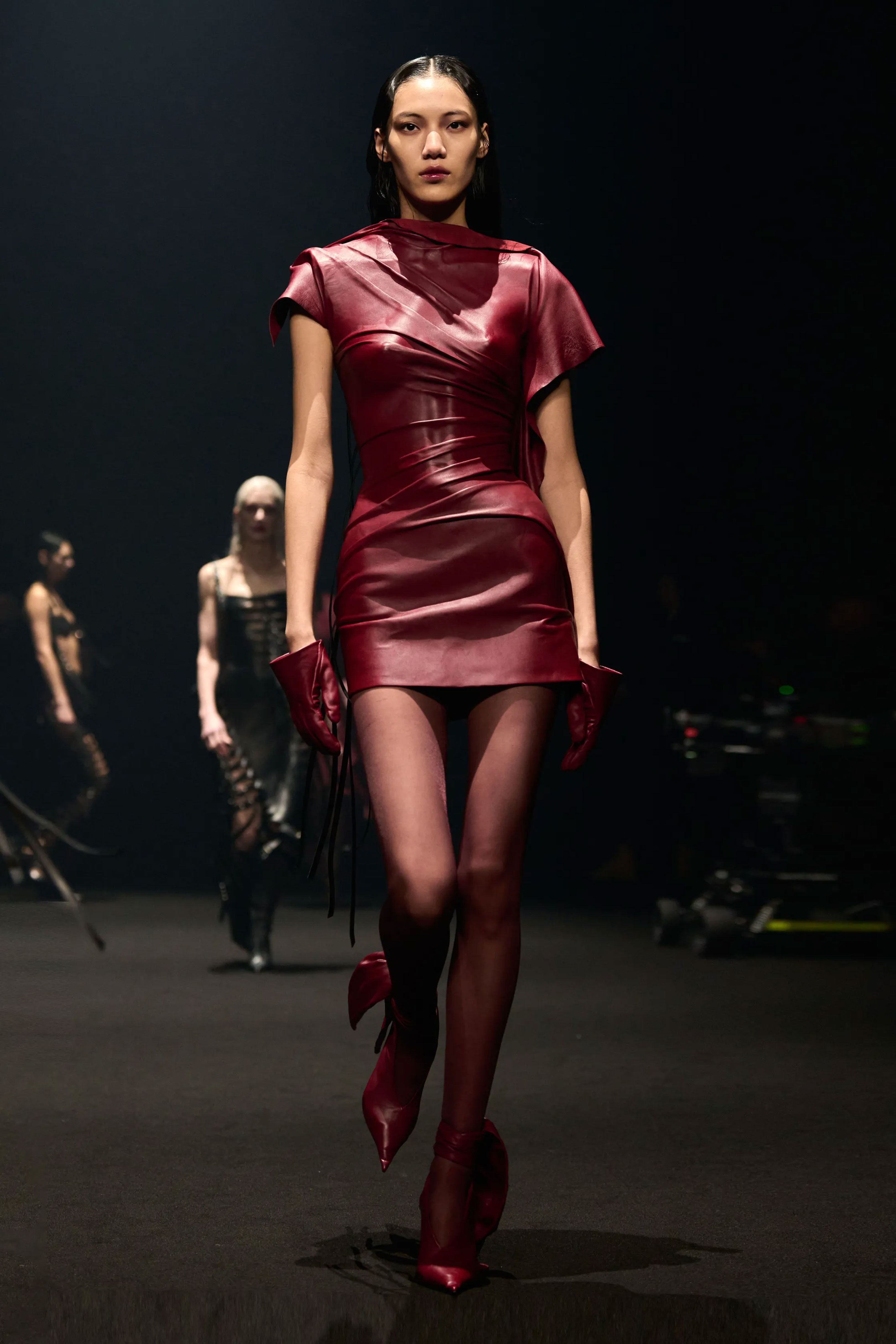 Позачасовим модним інструментом залишаються класичні чорні та інші колготи, що комбінуються з total-образами. На подіумі цю стилізацію вдало демонстрували Mugler, які можуть надихнути вас на поєднання кольорової моделі зі шкіряною сукнею в тон.
