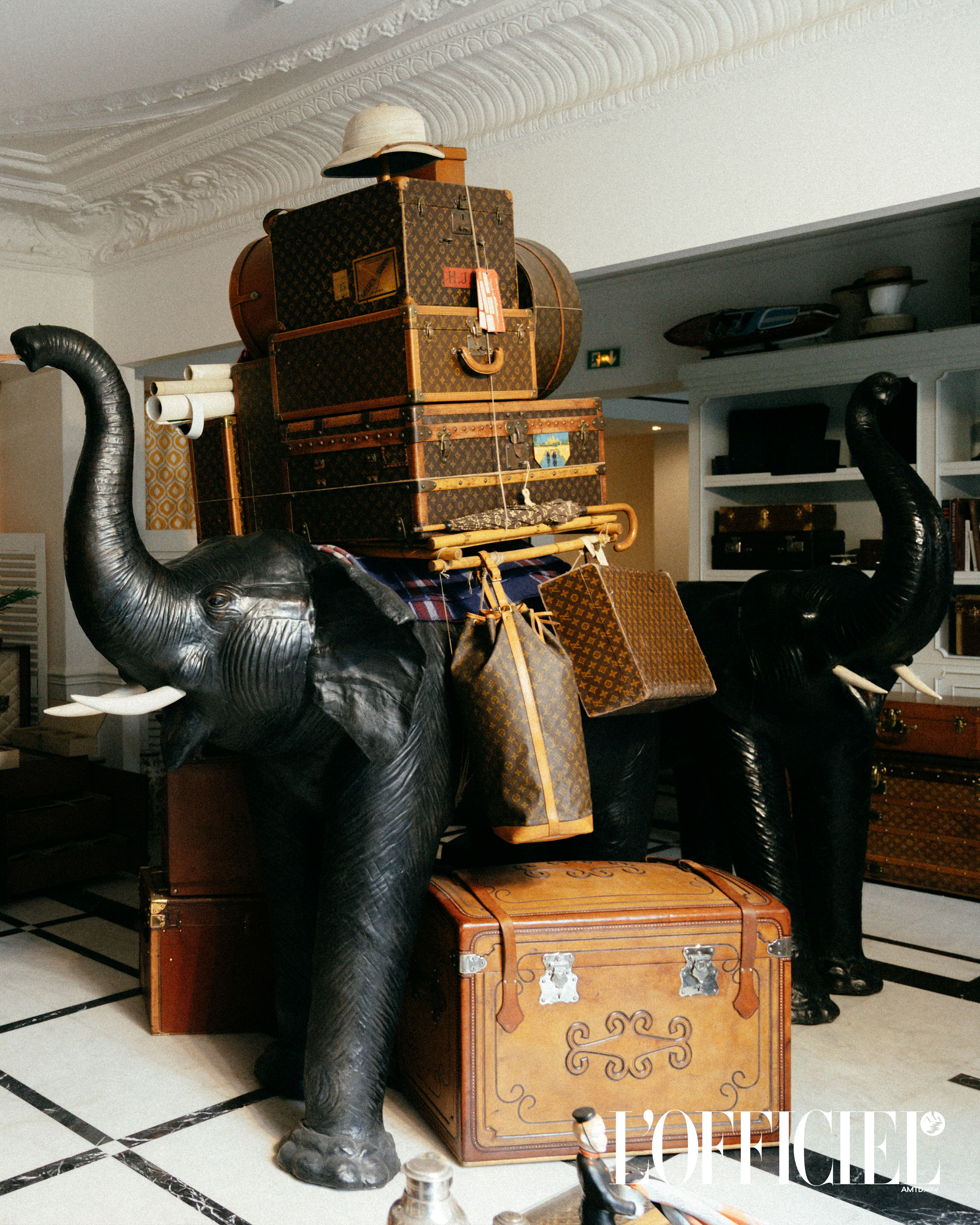 Наші слони – абсолютно унікальні й захопливі предмети. Виготовлені повністю зі шкіри, вони, ймовірно, були створені для Колоніальної виставки в Парижі в 1931 році для представлення Бельгійського Конго. Їхній каркас – із соломи, покритий шкірою, що надає їм вражаючої, майже живої присутності. На спину більшого ми додали вінтажний багаж – щоб створити враження надзвичайної подорожі крізь час і континенти. Ці слони ідеально втілюють наше бачення – діалог між об’єктом, історією та уявою.