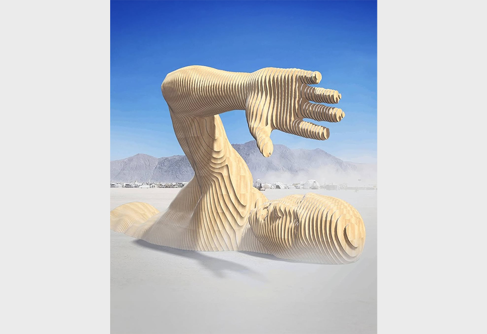 Дванадцятиметрова дерев’яна скульптура «Мерман» вагою 2,5 тонни отримала грант Burning Man ще у 2021-му, але її шлях до США зупинили пандемія та повномасштабна війна. За ці роки автор, Андрій Крапивченко, показував роботу в різних куточках Києва: біля Арки свободи українського народу, на дніпровській набережній та в Unit.City.