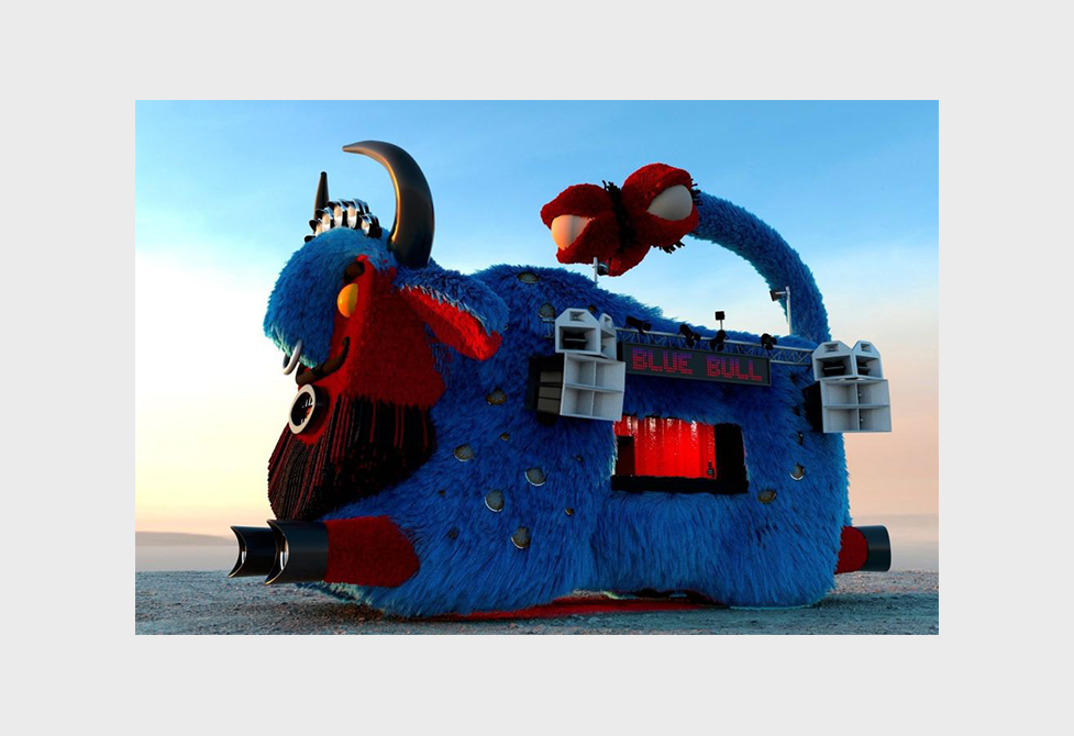 «Синій бик» — арт-кар, створений для мандрівок пустелею. Десятиметрову платформу, натхненну мотивами картини Марії Примаченко, вкрито синім хутром і доповнено світловими інсталяціями. Водночас інсталяція виступає сценою для концертів українських артистів — від реперки Alina Pash до «Воплів Відоплясова».