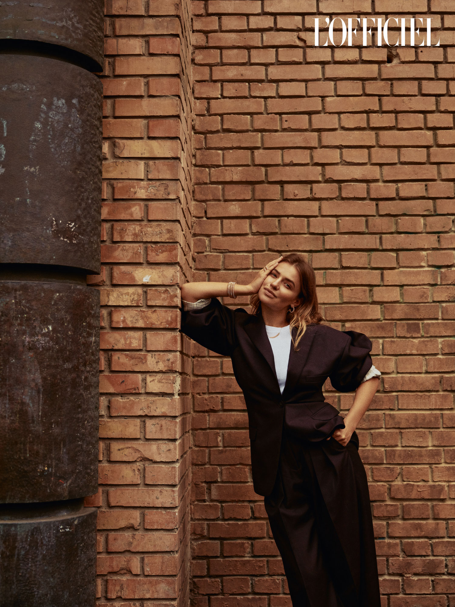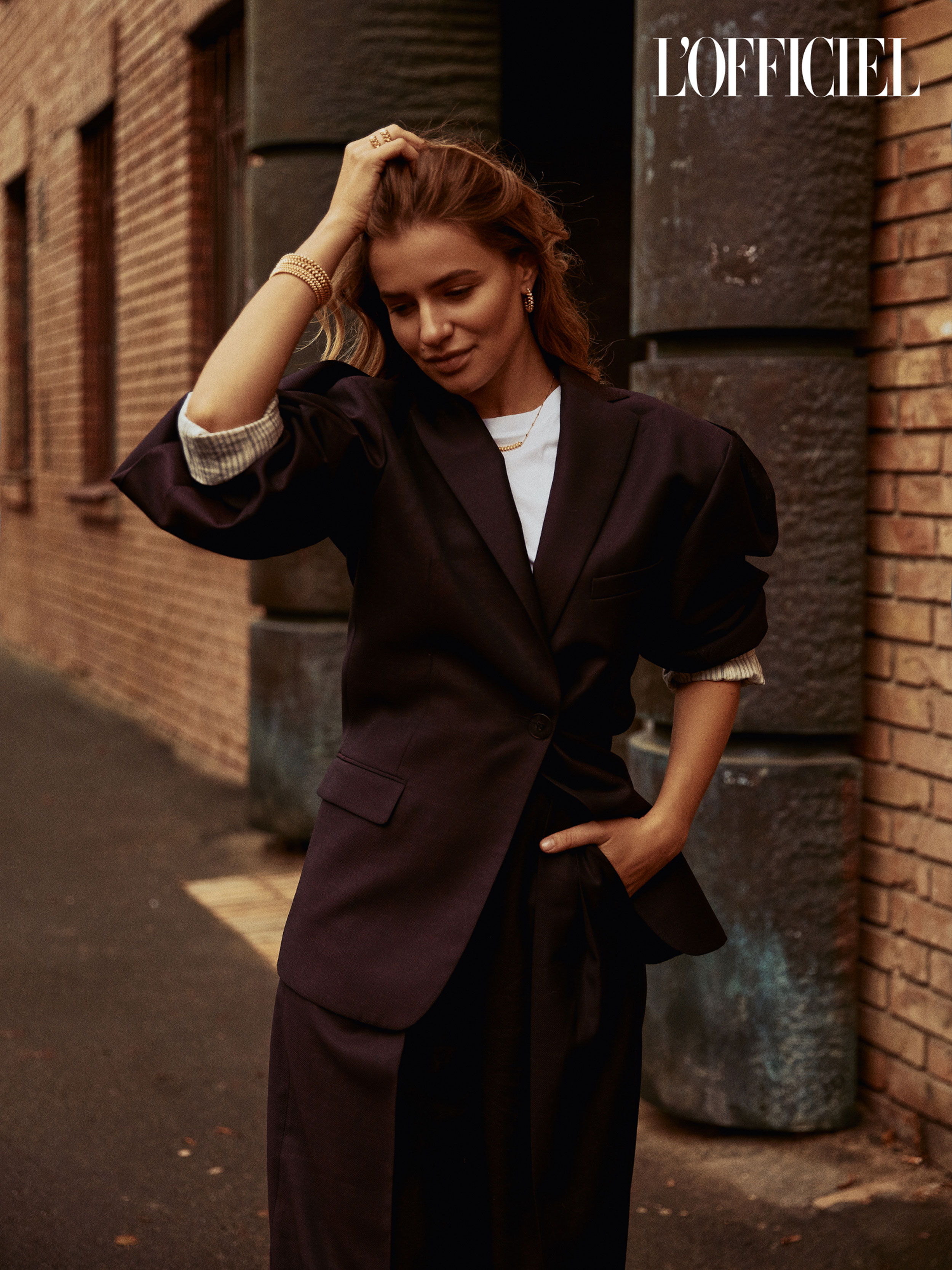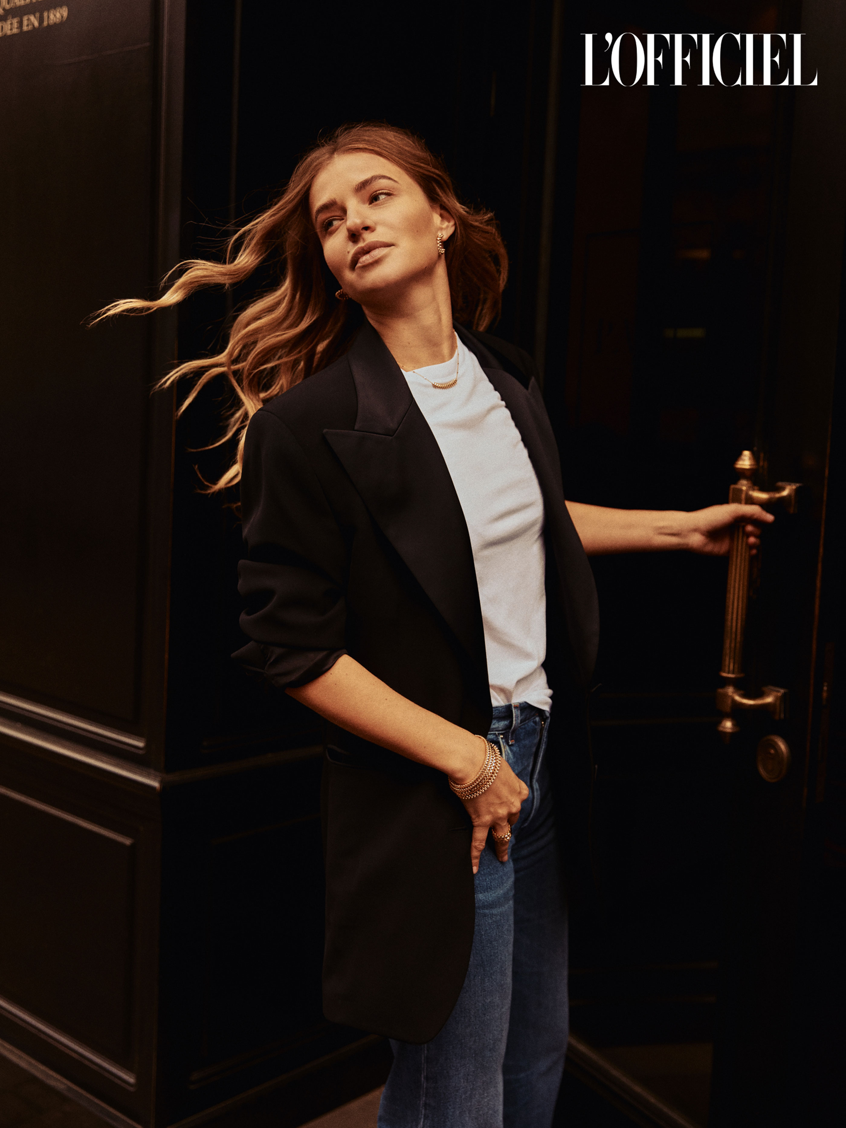 Пиджак, футболка Acne Studios, джинсы собственность героини, серьги, кольца, колье Clash de Cartier