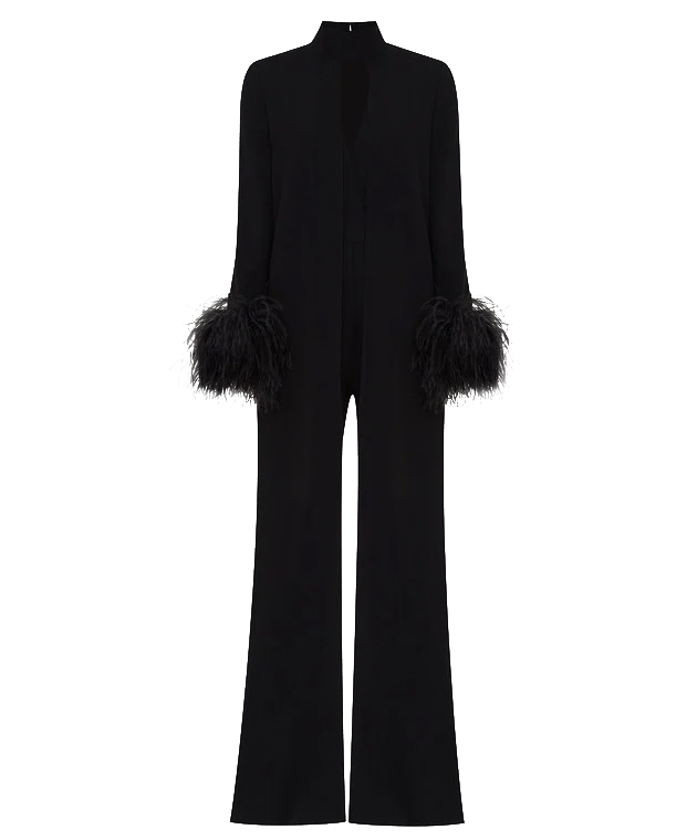 Еще одной альтернативой платью в новогоднюю ночь станет комбинезон. Выглядеть в таком роскошно — проще простого, а декор из перьев позволяет не тратить время на подбор аксессуаров — достаточно будет лишь тонкого шелкового шарфа, скрепленного брошью.