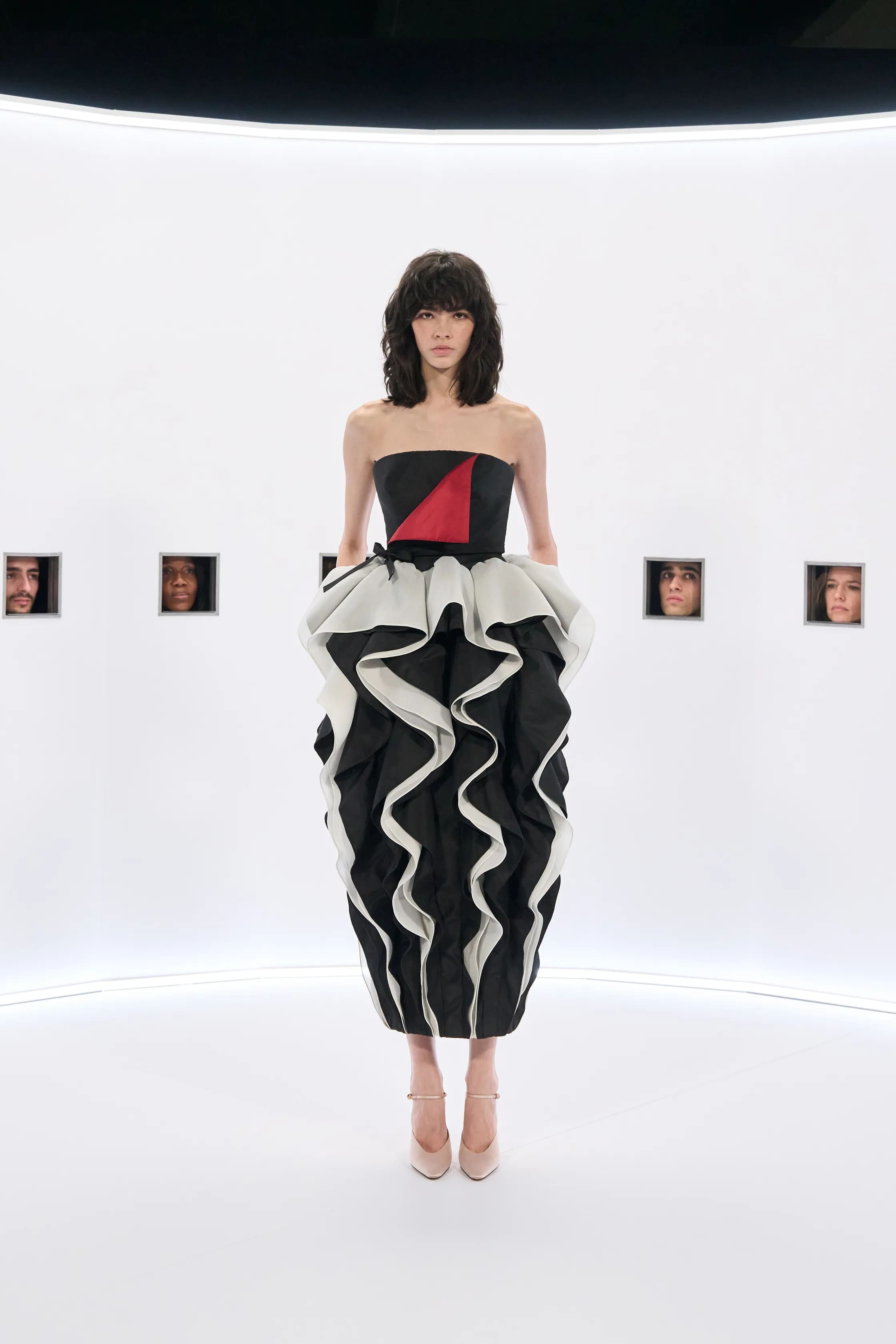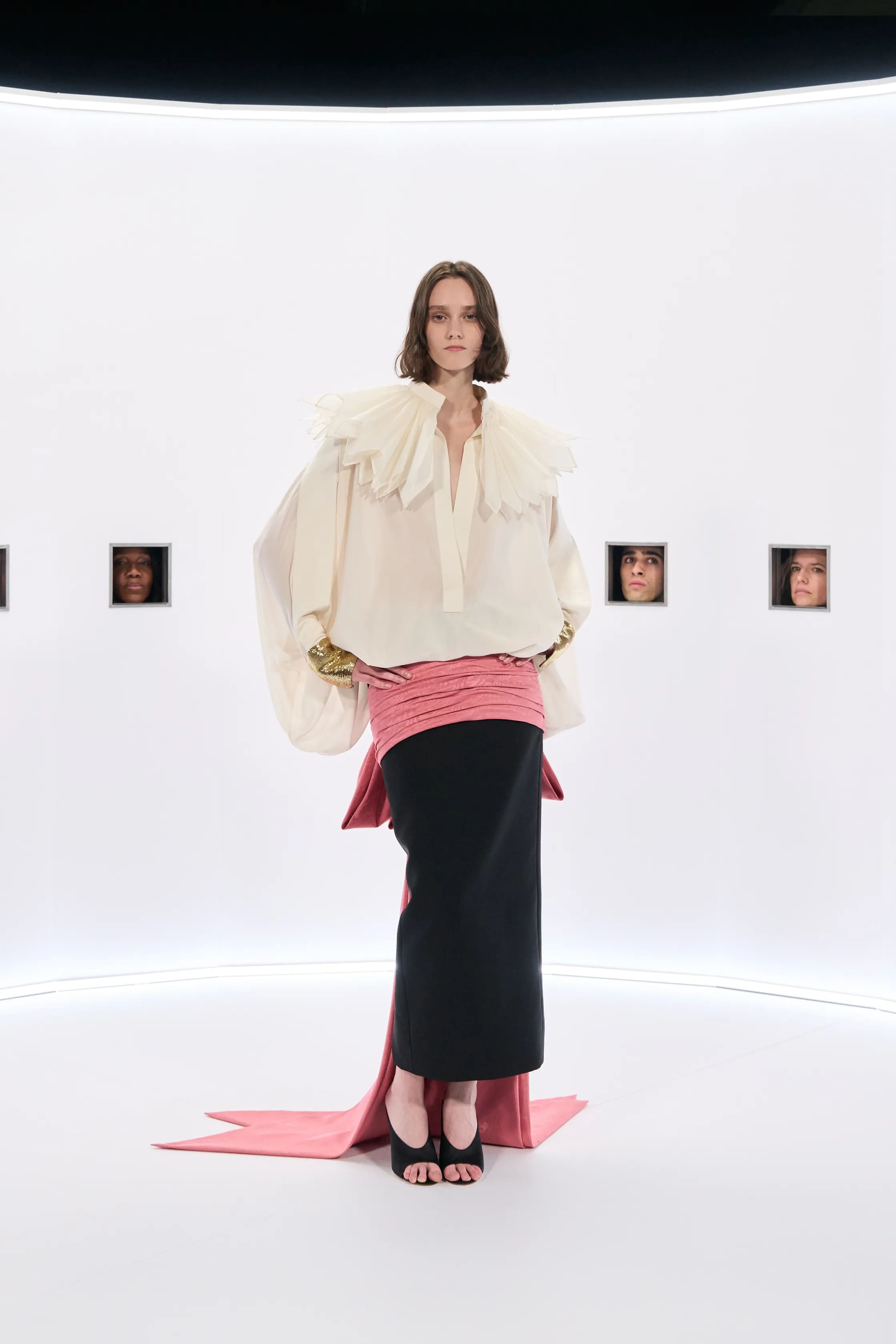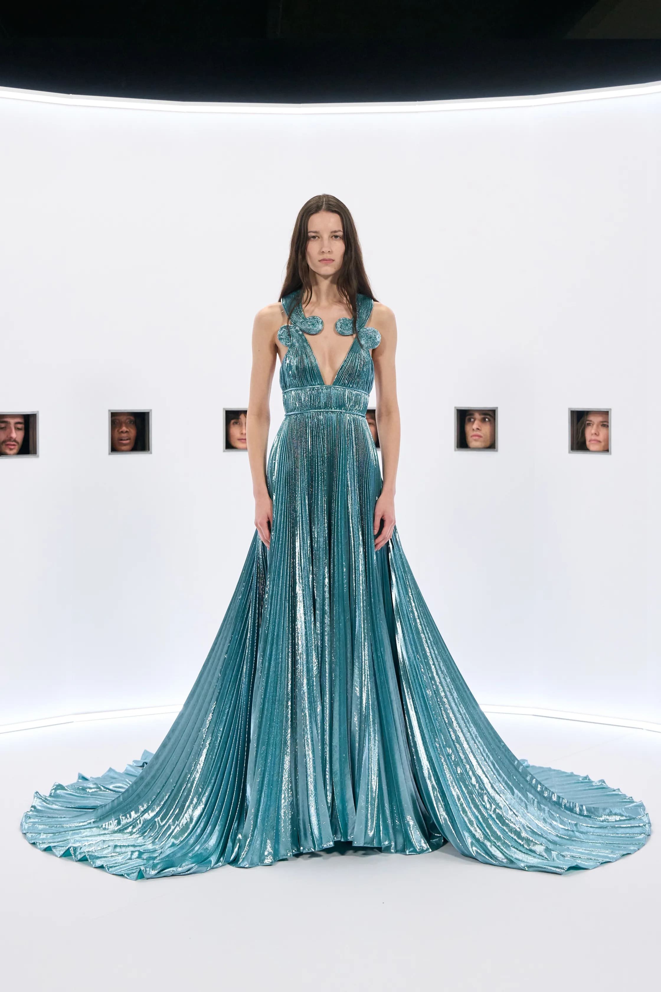 Нове шоу Алессандро Мікеле розгорнулося в Tennis Club de Paris, де дизайнер відтворив один з забутих прийомів у кіно. Моделі розташувалися в «кайзерпанорамах» - механізмах рухливого зображення 1800-х років, що має вигляд круглих стін з невеликими віконцями для глядачів. Такий сценографічний прийом дозволяв присутнім сповільнитися та звернути увагу на деталі образів spring-summer — 2026.