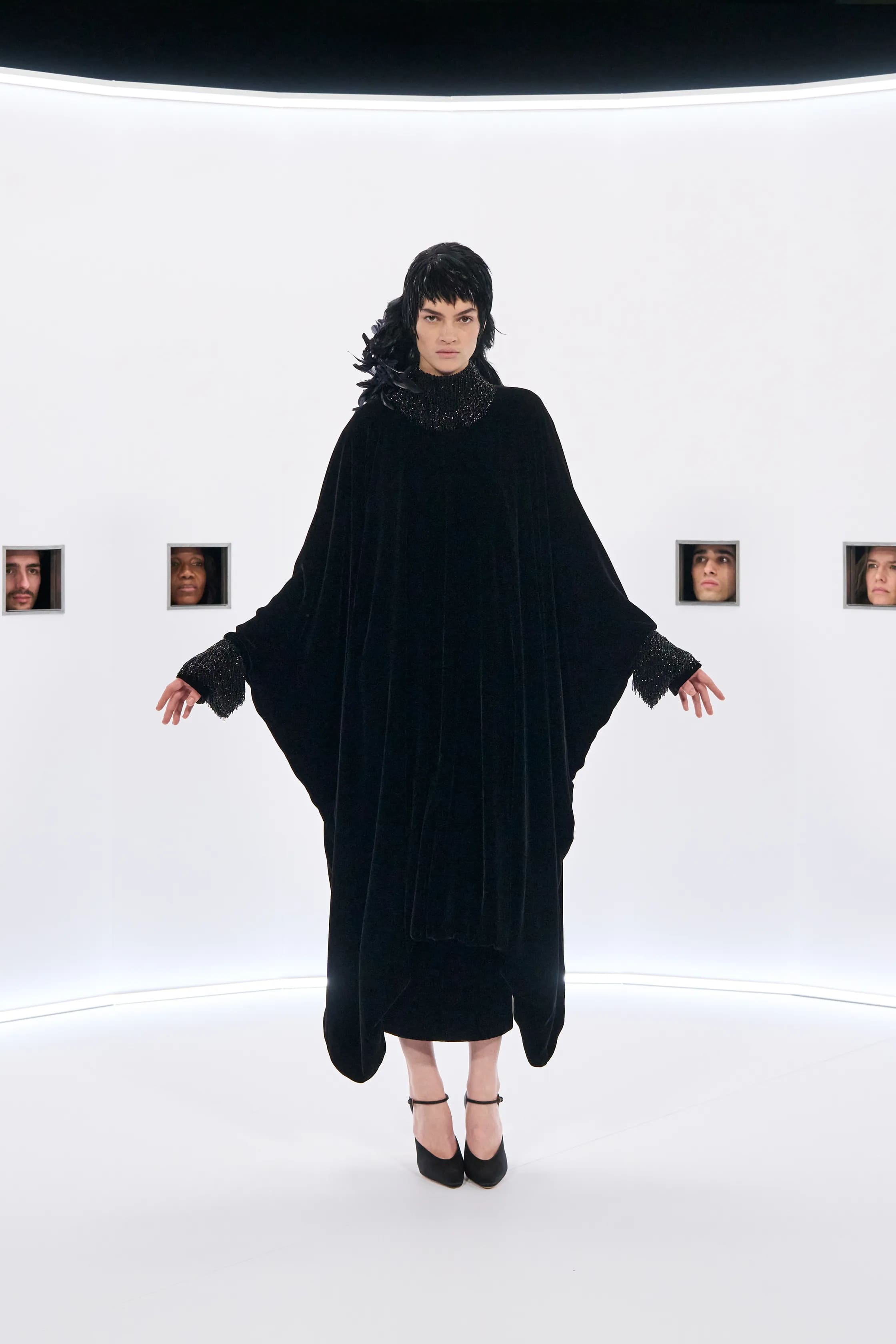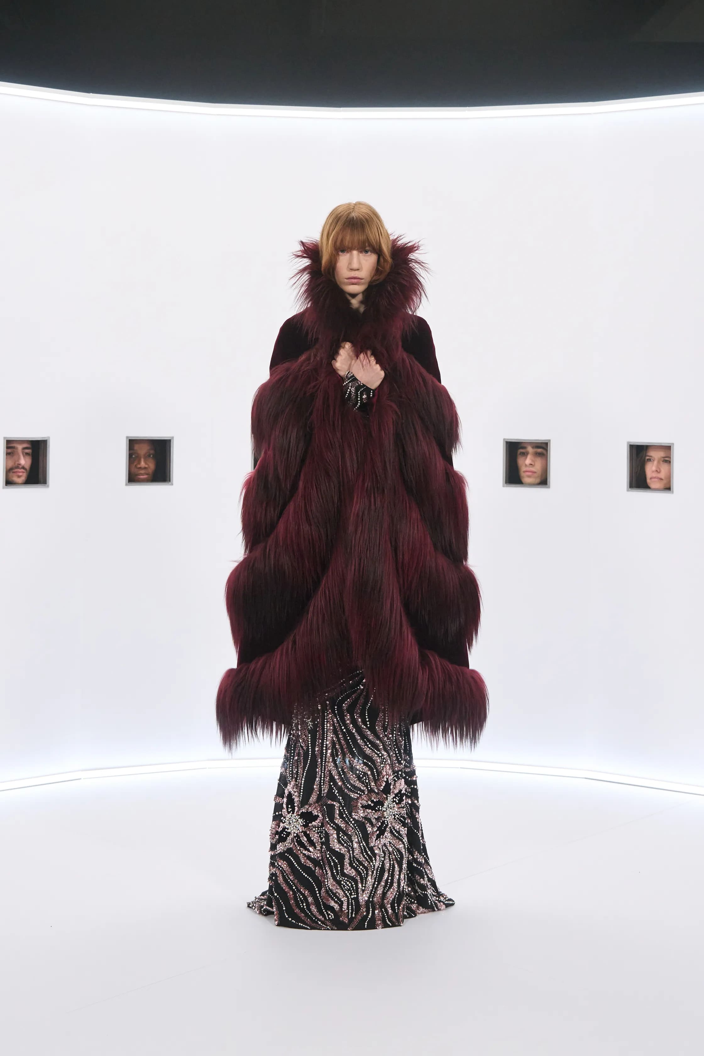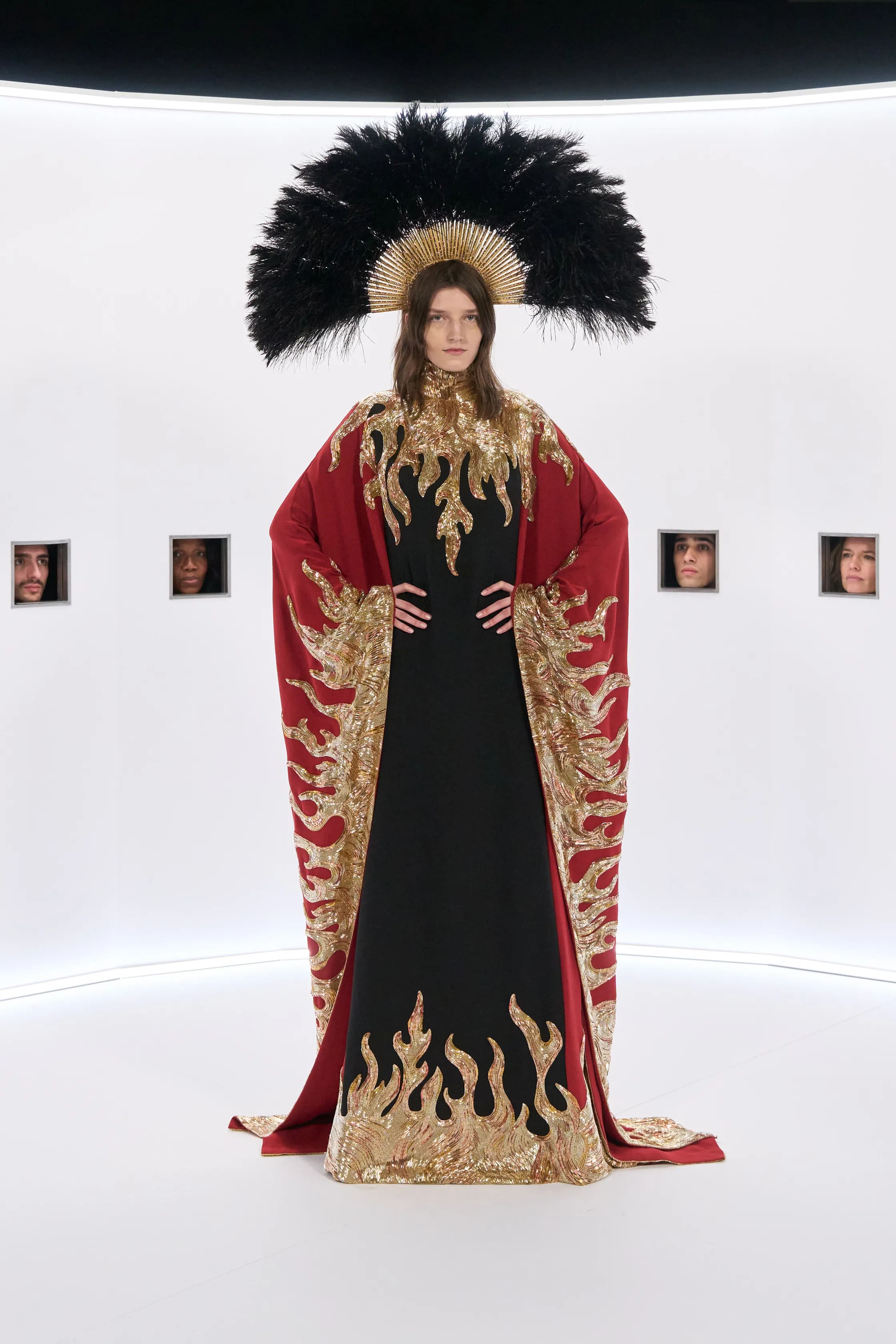 Ода кінематографу, до речі, близького для самого Мікеле, який проводив один із показів для Gucci в Голлівуді, продовжилася й в образах з нової кутюрної колекції. Сукні в оксамиті та шовку мали глибокі декольте, були розшиті камінням та лелітками чи складно драпіровані. Частину з образів прикрашало пір’я — не лише на одязі, але й на богемних аксесуарах, що імітували хвости павичів.
