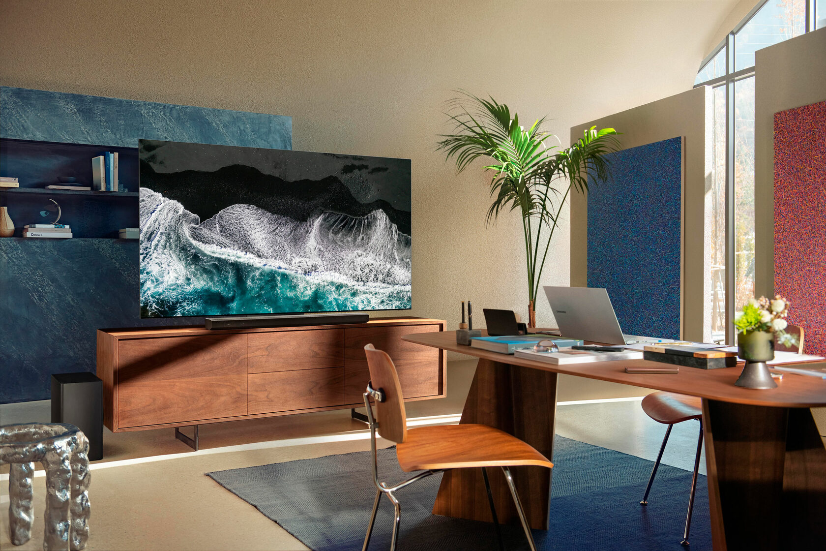 Телевизоры Neo QLED также оснащены новой аудиосистемой с динамиками, которые расположены на тыльной стороне их корпуса. Благодаря системе SpaceFit Sound устройство анализирует помещение и оптимизирует звучание под обстановку. Для этого используются дополнительные микрофоны, которые и оценивают разные параметры звука и его поведения в помещении, после чего SpaceFit настраивает звучание динамиков. Если вместе с телевизором вы приобретаете саундбар, то вам также будет доступна функция Q-Symphony, которая позволяет синхронизировать звук между встроенными и внешними динамиками системы, оптимизируя ее работу.