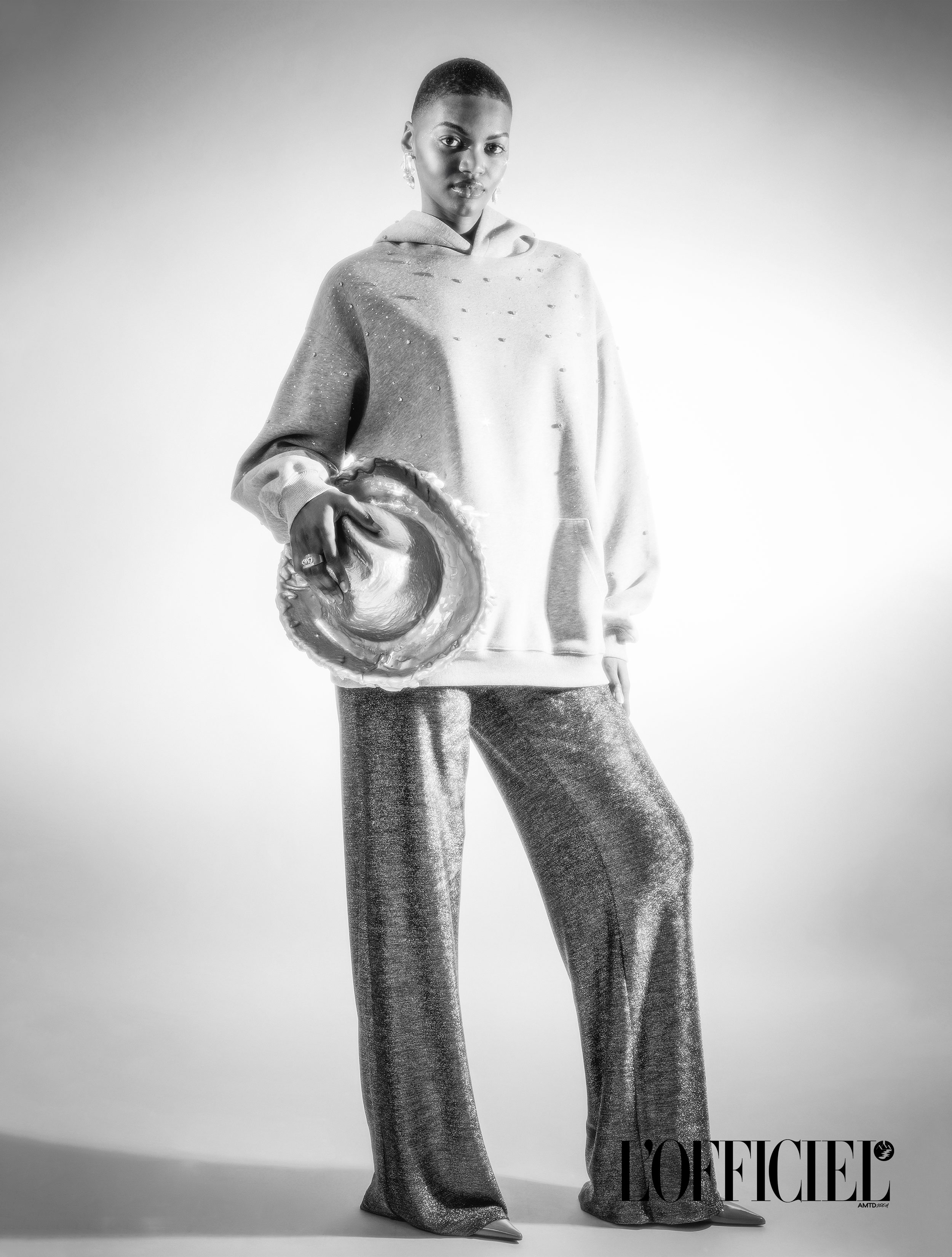 Hoodie: NEROSOLES @officialnerosoles @officalneronewyork. Pants: MANUFAKTUR BOSCANA GMBH @boscana_official. Earrings and Ring: SBB THE COLLECTION @sbbthecollection. Hat: BOURU (THE BOUJEE GURU) @theboujeeguru