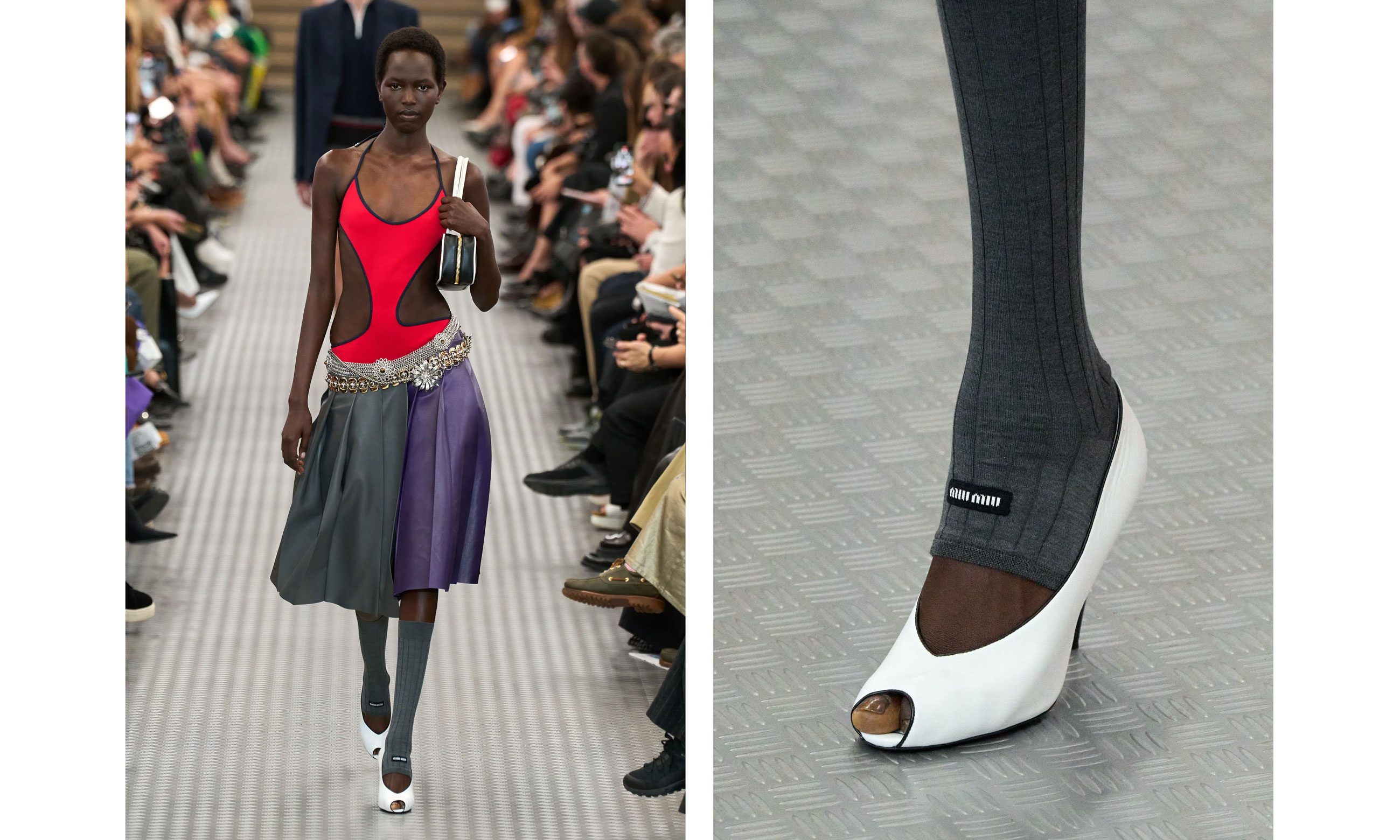 Зі свого боку Miu Miu занурилися в ретро-настрій, пропонуючи доповнювати високі peep-toe гетрами, а Prada зробили ставку на сіро-рожеве смугасте поєднання. Заразом на подіумі Stella McCartney було одразу кілька взуттєвих моделей із відкритим мисом. Серед них мюлі та слінгбеки в трендовому плетеному виконанні.