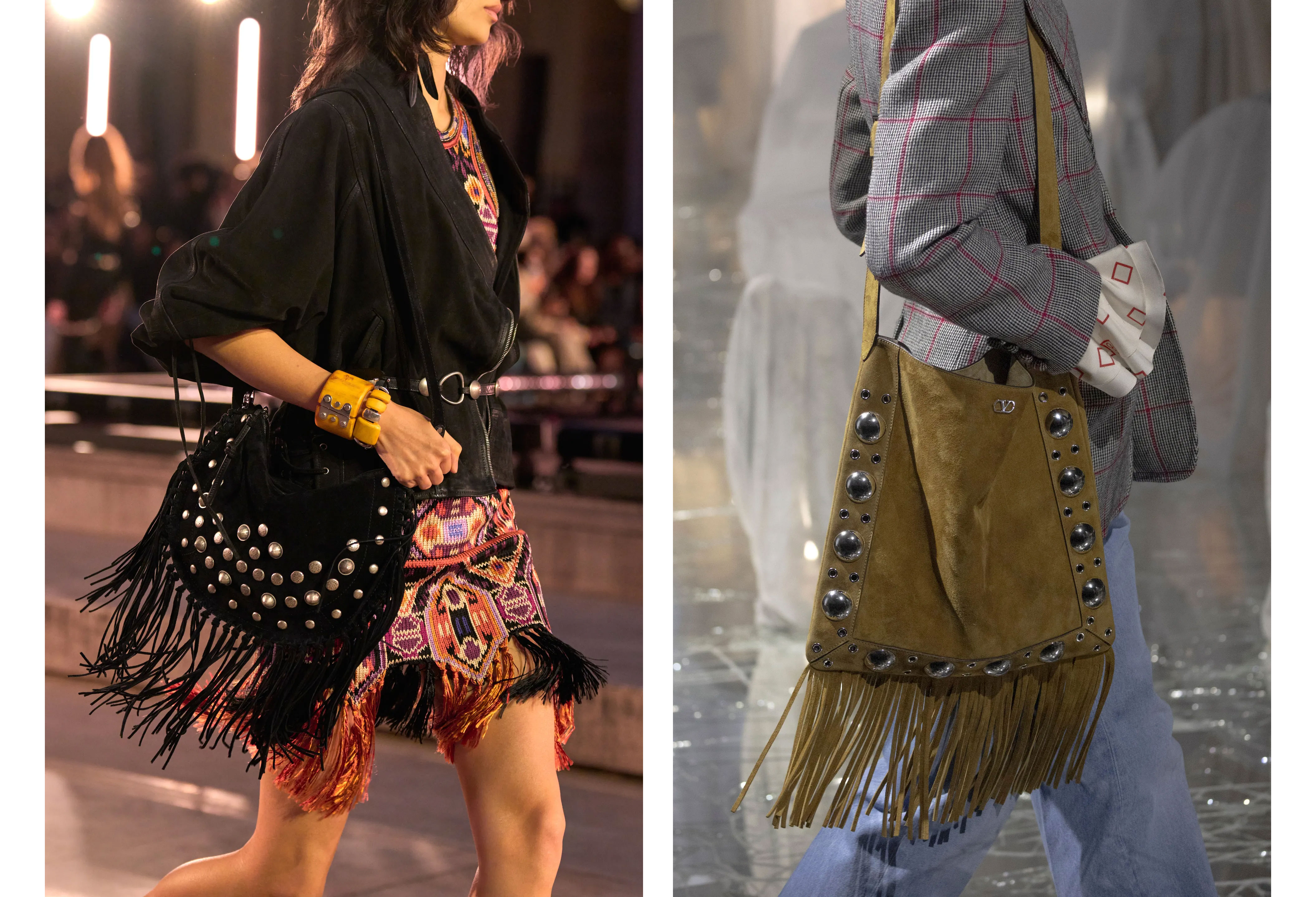У Valentino й Khaite сумки із заклепками відсилали до моди 70-х років, підтримуючи тренд на повернення бохо-шику, невимушеного, волелюбного стилю хіпі в гламурній інтепретації. Їхні моделі доповнювалися грайливими торочками — ще одним провідним трендом цьогорічних весни й літа. До речі, саме замшева опція від Valentino вже була додана Беллою Гадід та Алексою Чанг у їхні гардероби.