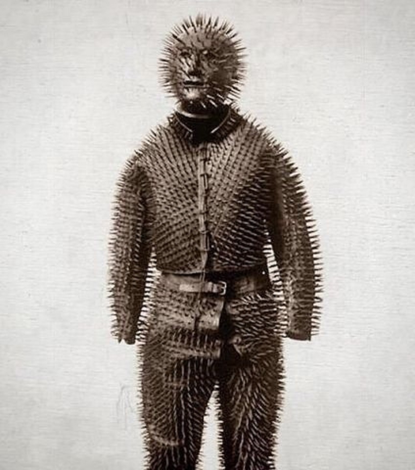 Он появился в музее Менил в конце 80-х, и, говорят, рядом была лишь табличка "костюм для охоты на диких зверей 18-19 века. Германия или Швейцария". Фото удивительной брони разошлось по всему интернету и овеяно легендами.