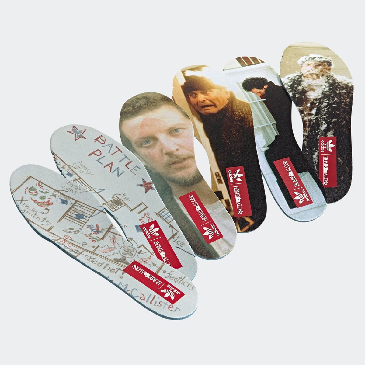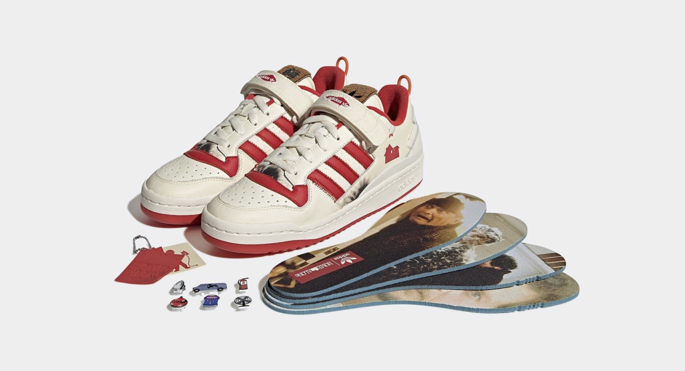 Новые кеды Adidas выполнены из белой экокожи с красными вставками и дополнены декором в виде копоти, словно после взрыва камина, как в оригинальном сюжете "Одного дома". На "язычке" можно заметить логотип рождественского фильма. Вместе с обувью в комплект войдут металлические значки, которые можно прикрепить на шнурки, и стельки с изображением сцен из ленты "Один дома".