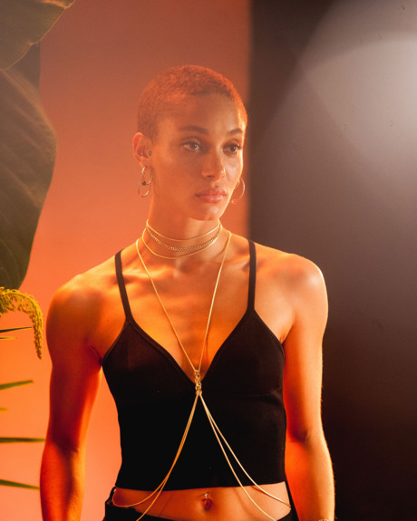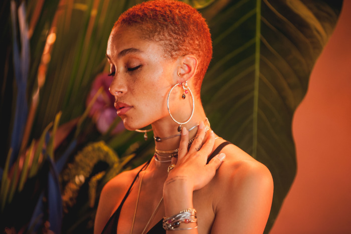Основой для коллекции стали цепи ювелирного бренда, которые Холли и Адвоа представили в форме сбруи, браслетов из крученого металла и сережек-капелек. В некоторых украшениях присутствуют и цветовые акценты в виде камней: пирита, черного и розового турмалина, гематита, розового кварца и шпинеля. Вдохновением для одного из колец стал перстень бабушки Адвоа Абоа, который модель реинтерпретировала с использованием камней. Стоимость изделий стартует с $ 295 за одну сережку, а самым дорогим изделием стала цепь для тела за $ 24 000.