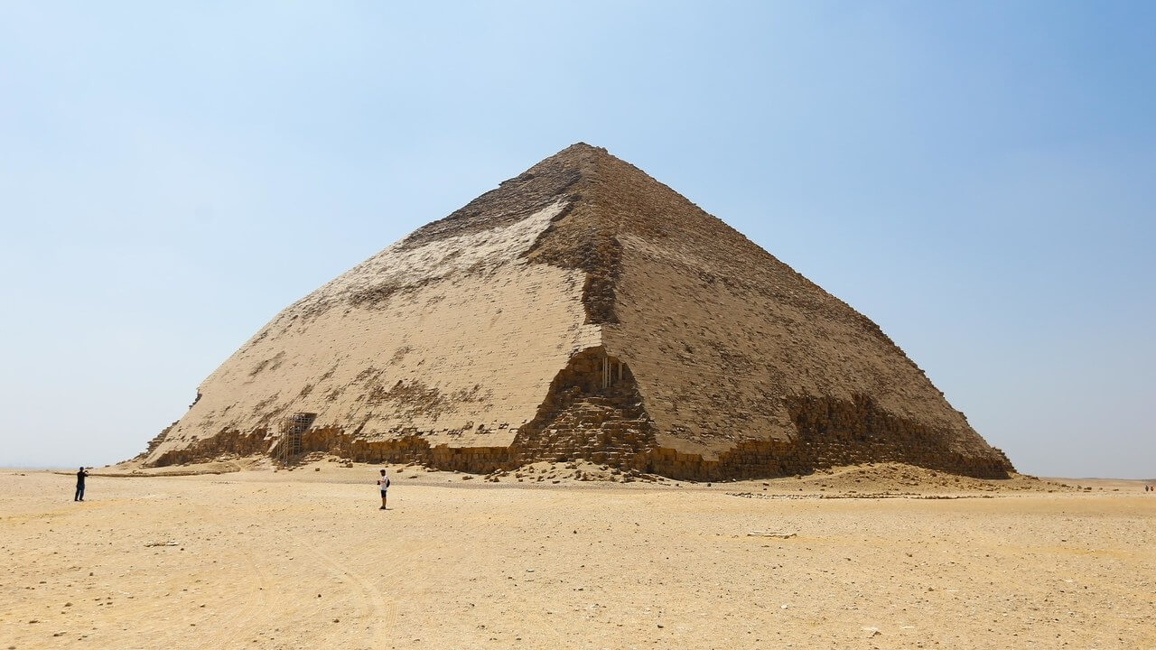 Первую пирамиду называют “изогнутой” из-за ее неправильной формы. 101-метровое сооружение имеет необычный внешний вид, обусловленный изменением наклона: первые 49 метров были построены под углом 54 градуса, в то время как верхняя половина — под углом 43 градуса. По одной из версий, строители изменили наклон, чтобы ускорить процесс сооружения, так как смерть фараона была близка. Также ученые предполагают, что это было сделано с целью укрепления пирамиды, чтобы она не упала на себя.