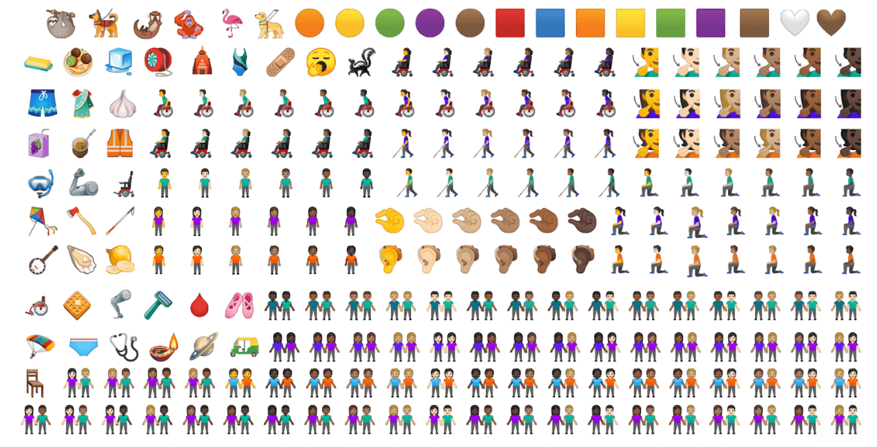 Эмодзи с изображениями пар разработаны в 75 вариантах: с разными оттенками кожи, в их числе и однополые. К символам еды добавят новые продукты питания, такие как чеснок, фалафель, масло и вафли, а из животных появятся ленивец, скунс, фламинго и орангутанг.