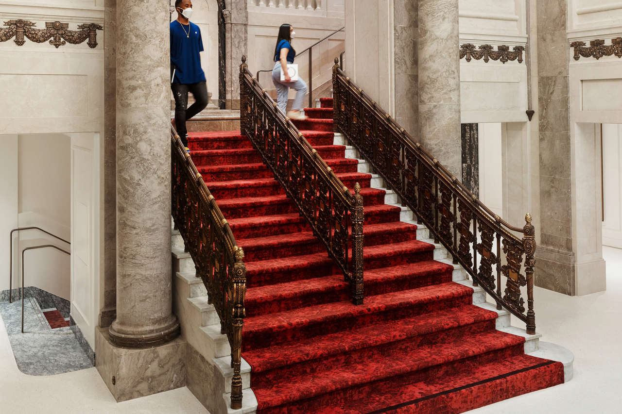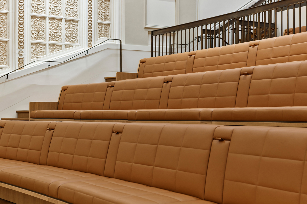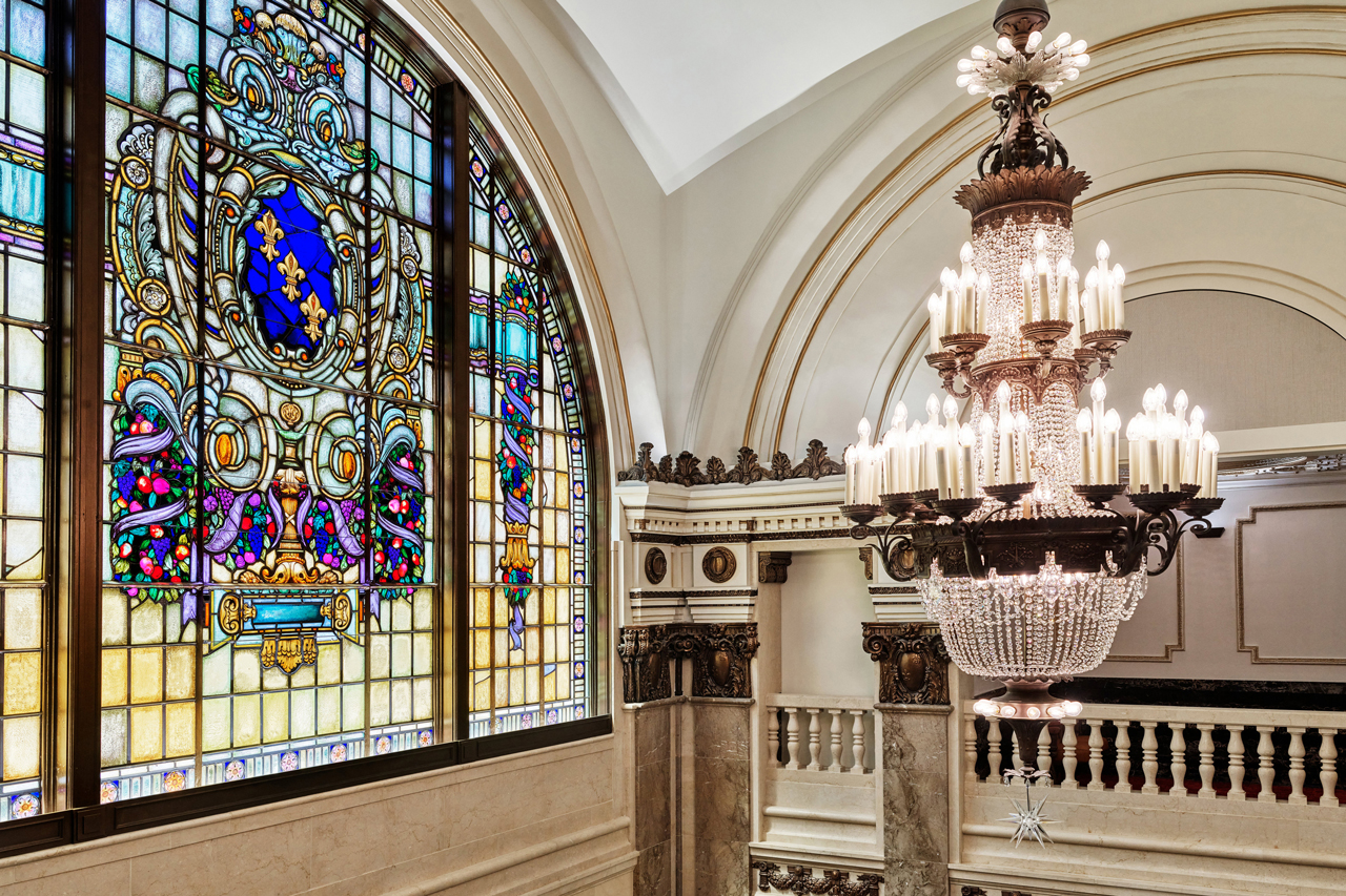 Внутри оставили вестибюль, оформленный в стиле Парижской оперы Шарля Гарнье, арочную лестницу с бронзовыми поручнями и мраморными коринфскими колоннами. Бывший зрительный зал оставили в оригинальном дизайне, с арочными нишами и бронзовой облицовкой, а также отреставрировали кресла — теперь тут будут проходить конференции и презентации бренда. А вот лифты в здании заменили полностью.