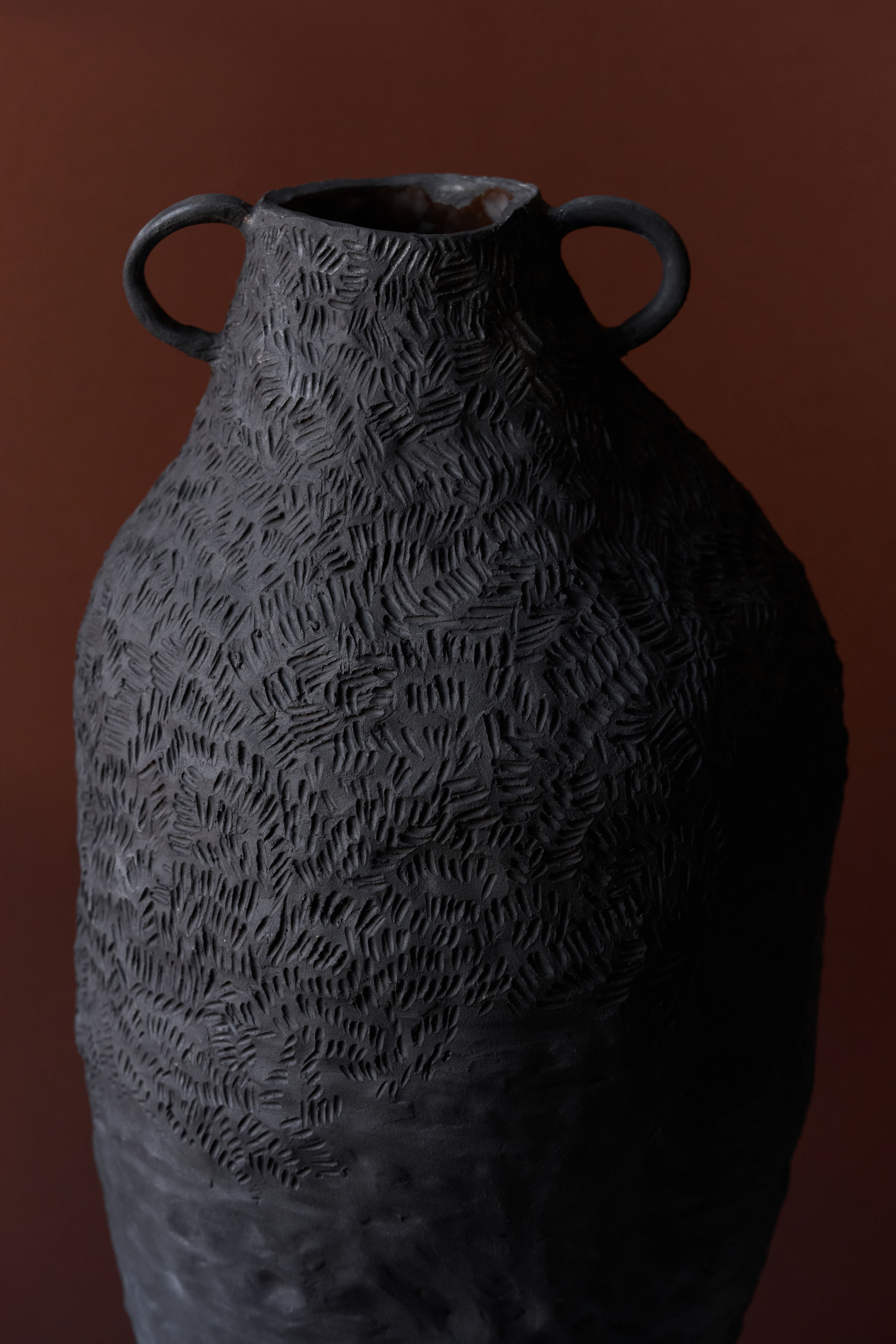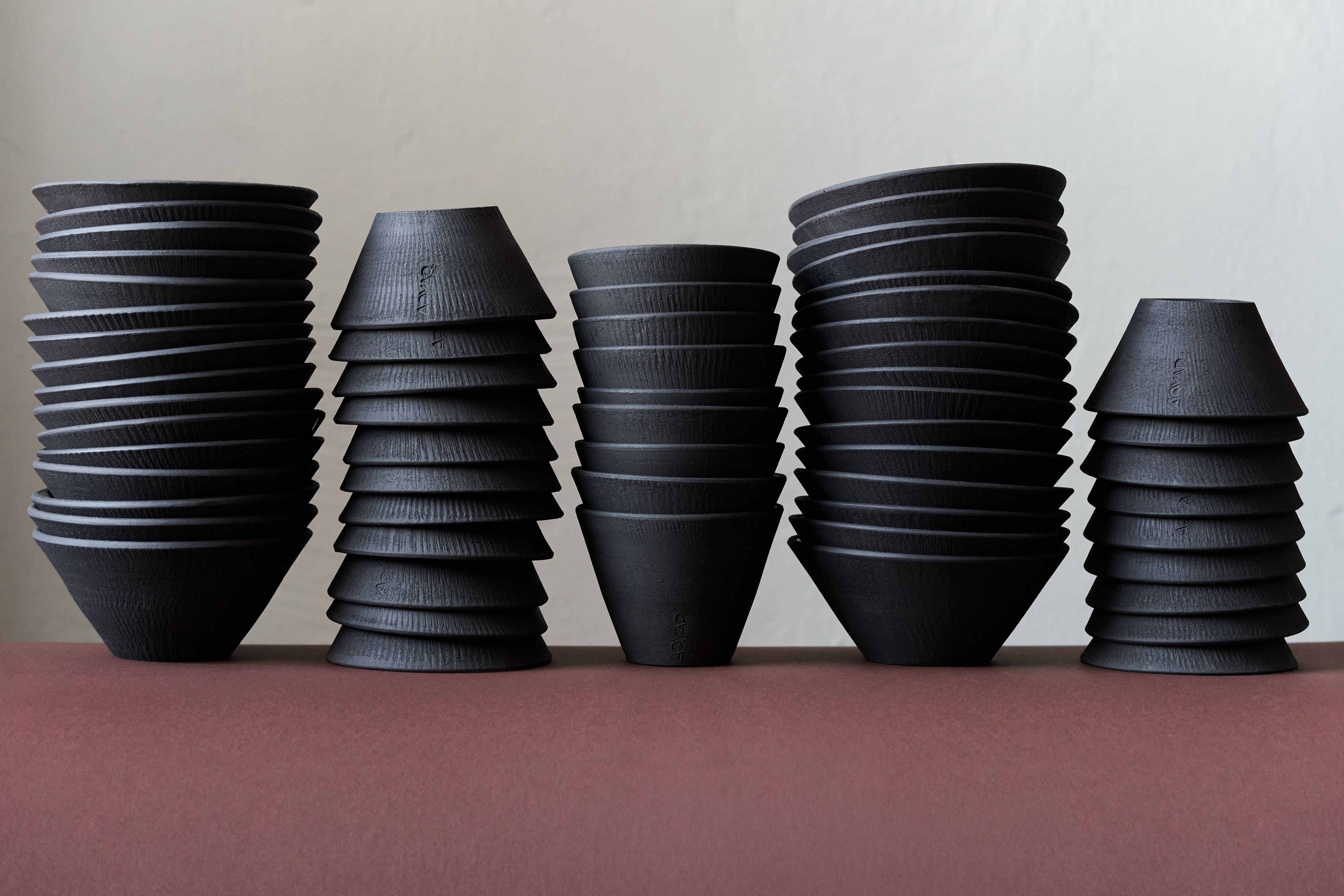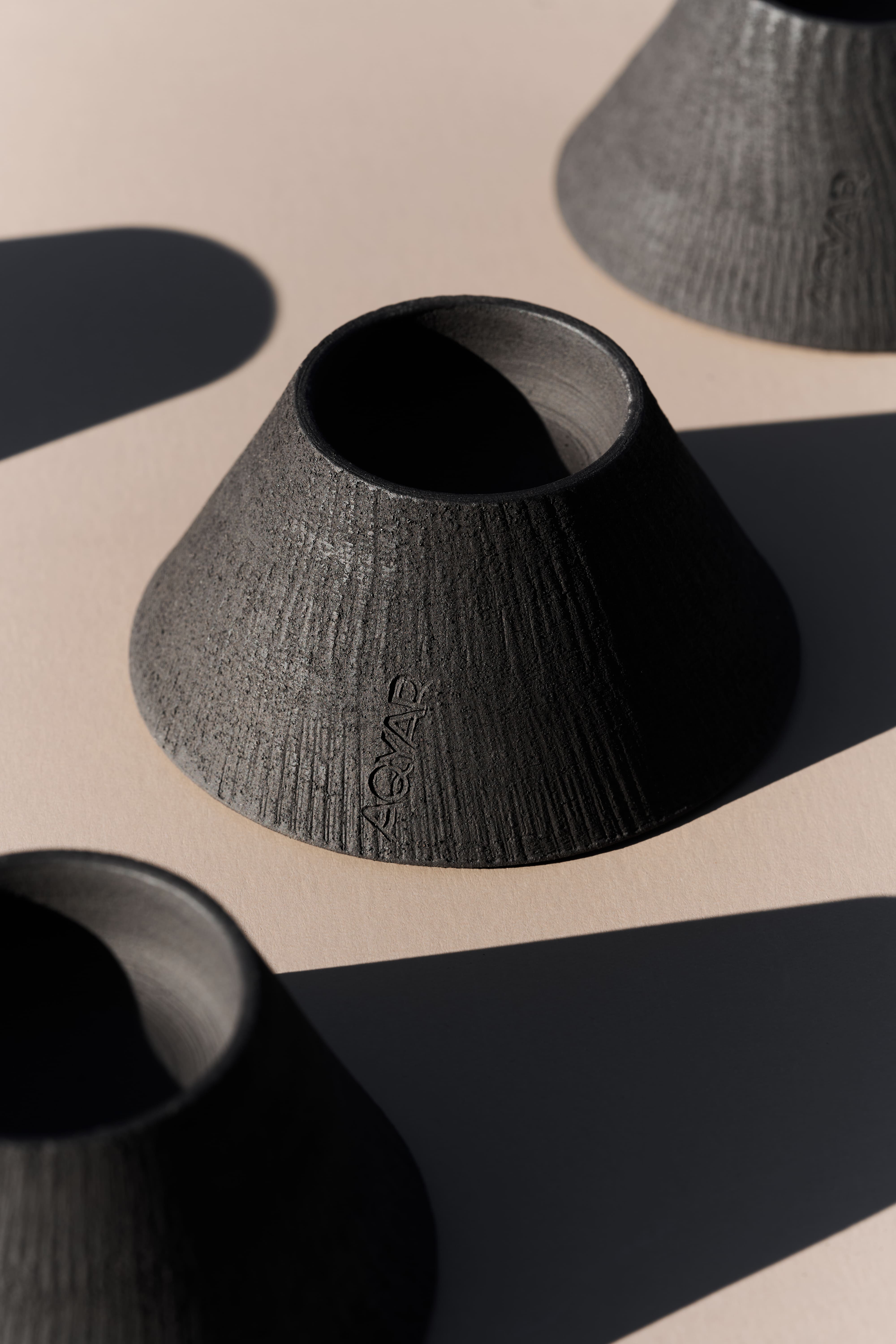 Спеціально для проєкту Еля вручну виліпила 7 унікальних ваз із чорної глини, кожна – окремої форми та дизайну. Лімітовану арт-серію доповнили ще 300 керамічних побутових предметів: горнятка, підсвічники та боули, згончарені майстрами Aqyar Ceramics.
