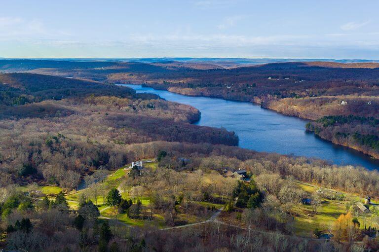 Главный дом площадью 832 квадратных метра расположен на одном из самых высоких холмов Бедфорда из него открываются виды на озеро Кротон и Гудзонские высоты. Внутри дома  5 спален, просторная гостиная, кухня и столовая со светлыми интерьерами. В каждой комнате есть камин. Вместе с гостевыми домами поместье насчитывает 12 спален.