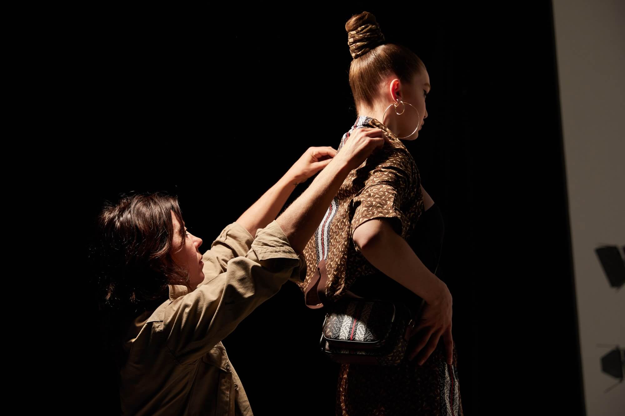 Для образа леди Джиджи Хадид предстала в тренче с монограммой и юбке до колен, как девушка она одета в топ-бюстье и шелковые брюки с поясной сумкой, как джентльмен - с классическим зонтом-тростью, и в образе мальчика модель одета в худи и кроссовки.