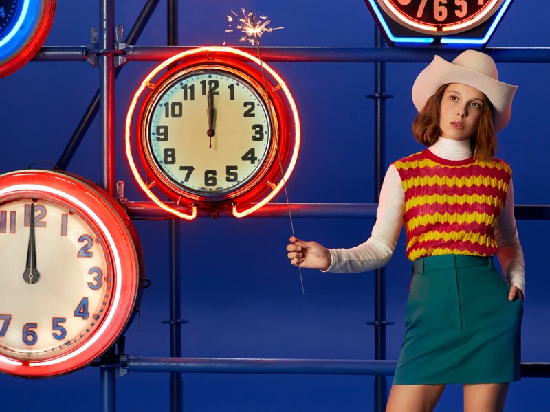На снимках актриса изображает моменты предпраздничной суеты: приезжает домой на праздники в леопардовом пальто и с чемоданом, обнимается с собакой и в ковбойской шляпе зажигает бенгальские огоньки. В короткой видеокампании Милли танцует и делает селфи в сверкающем мини-платье.