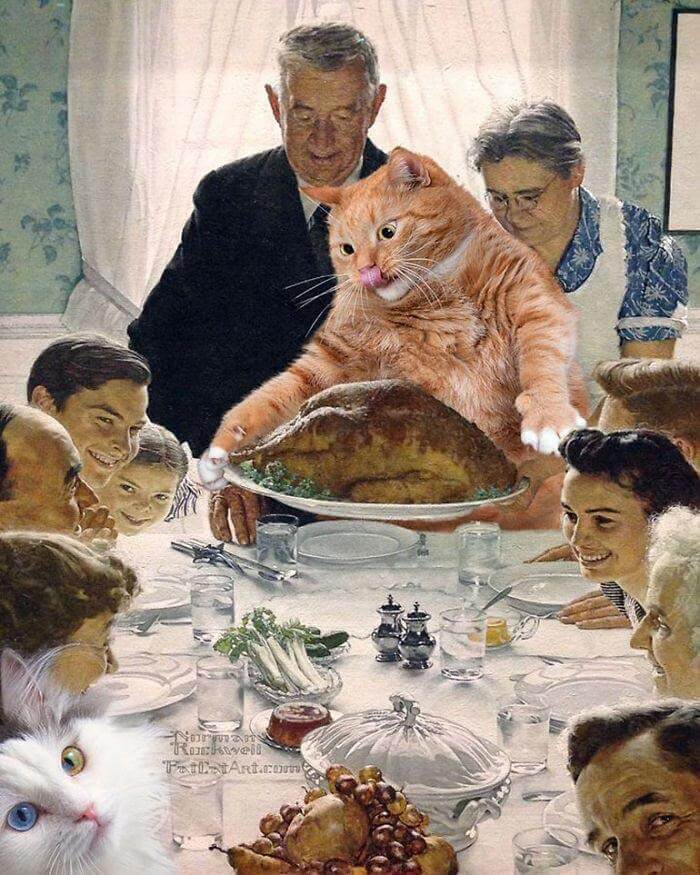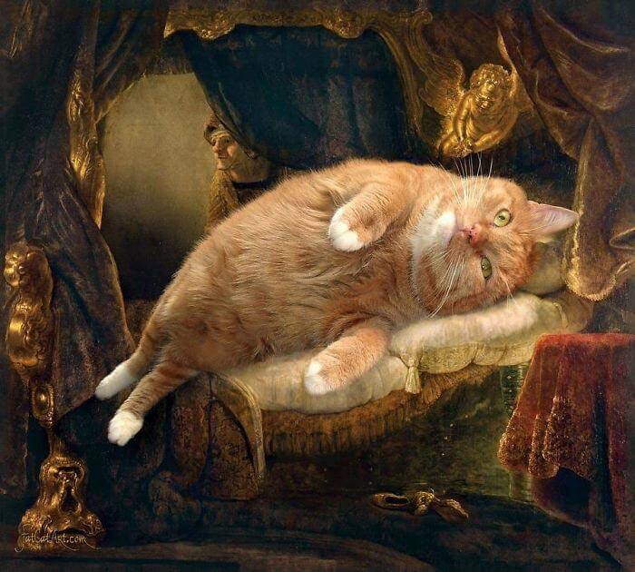 Светлана говорит, что главный художник из них двоих — именно Заратустра. “Я всего лишь скромный ассистент Ее Пушистого Величества, — говорит художница. — Она любезно позволяет мне применять свои навыки рисования, фотографии и фотошопа, чтобы вставить ее драгоценные изображения в шедевры старых мастеров”.