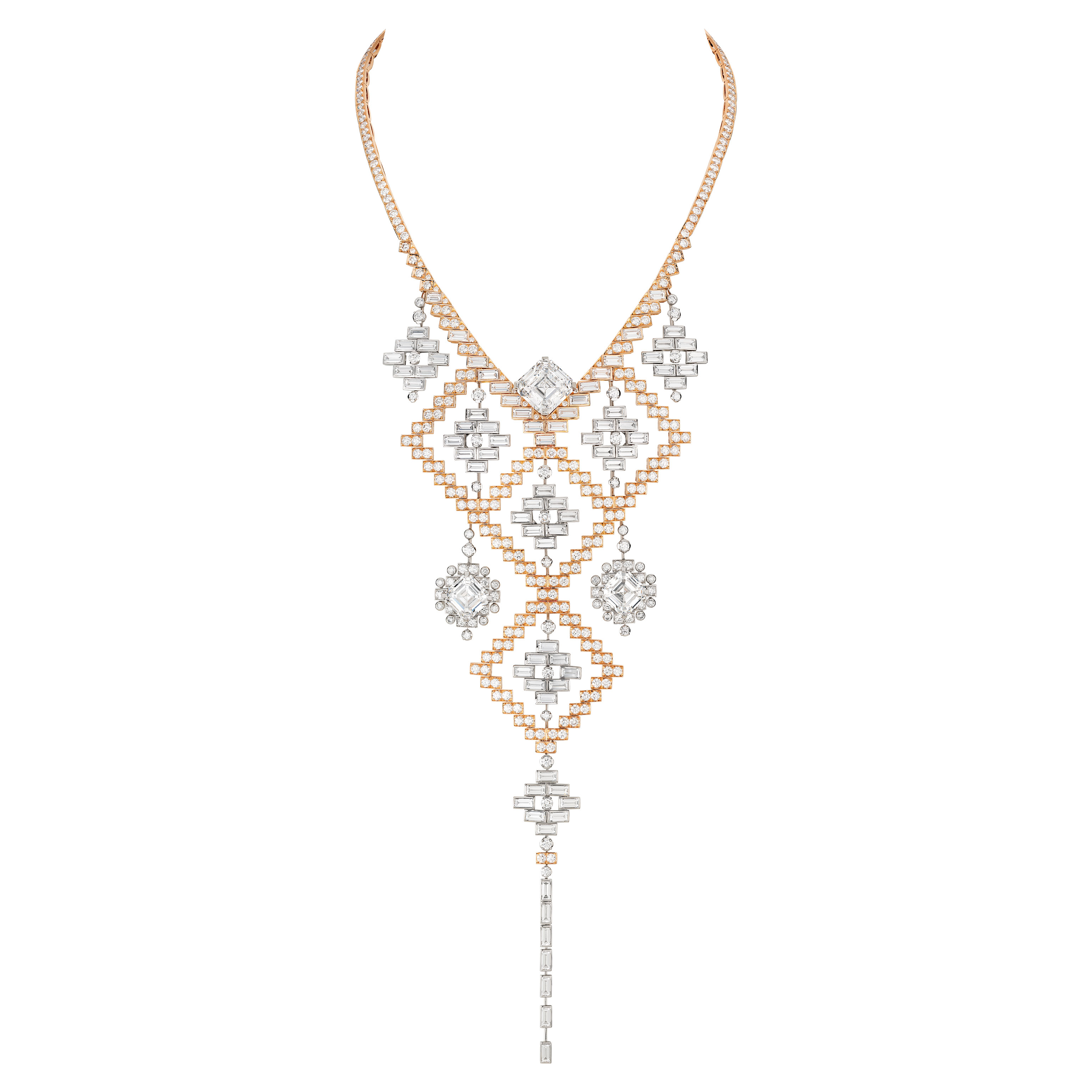 В коллекции представлены драгоценные ожерелья, броши, кольца, браслеты и часы, инкрустированные бриллиантами.