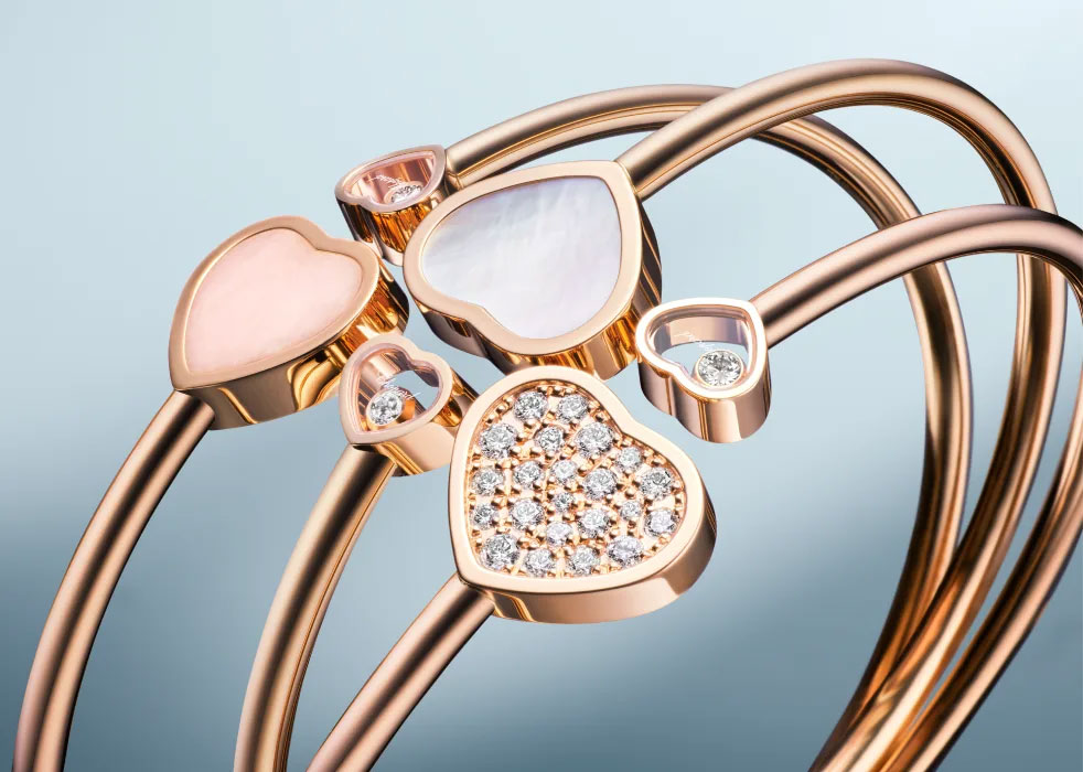 До колекції ввійшли ювелірні вироби з діамантами та натуральним дорогоцінним камінням. Центральний елемент капсули — серця, які доповнюють браслети, перстні та підвіси. Прикраси Happy Hearts представлені в жовтому та рожевому золоті, добутого етичним шляхом.