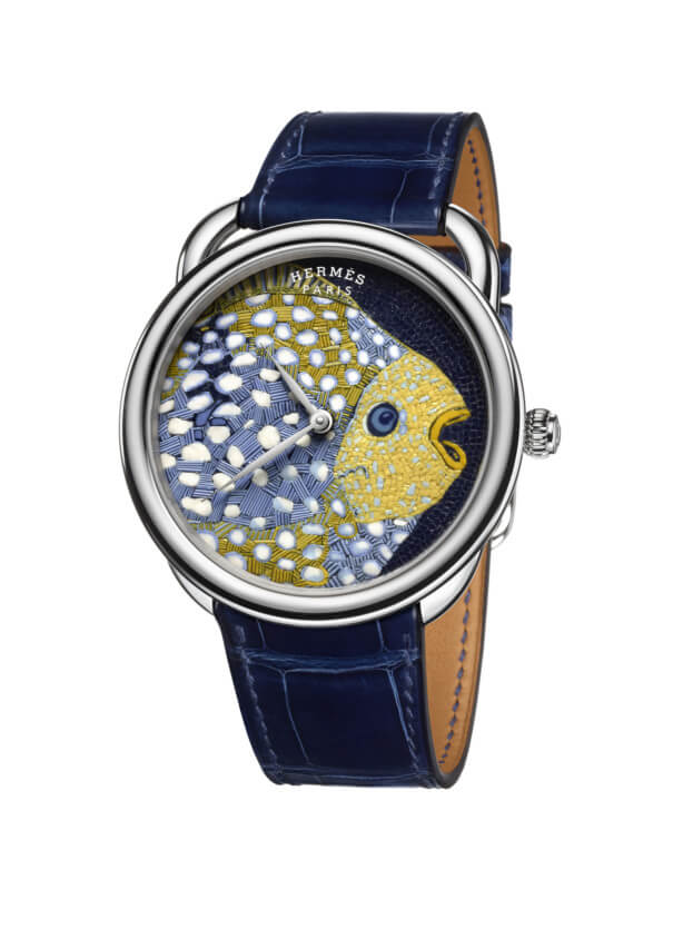 Впервые модель наручных часов Hermès Arceau разработал дизайнер Анри д’Ориньи в 1978 году. На циферблате изображена яркая экзотическая рыба, рисунок выполняется вручную в виде микромозаики из стекла. Аналогичным изображением украшен платок каре Grands Fonds (“Глубокие воды”), авторство рисунка принадлежит французской художнице Анне Фэвр. Циферблат обрамлен круглым корпусом из белого золота с ушками в форме стремян и прикреплен к синему ремешку из кожи аллигатора.