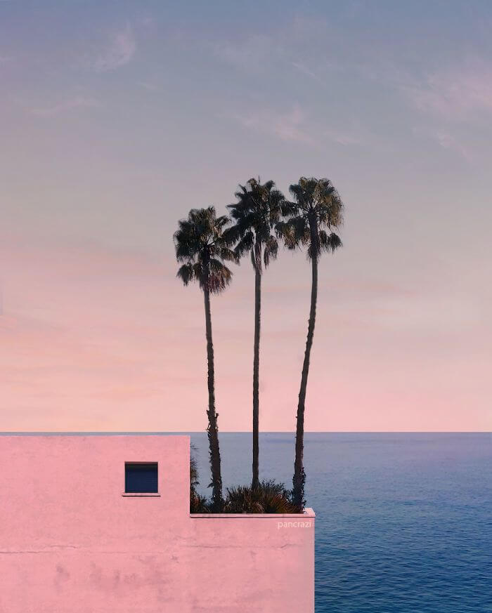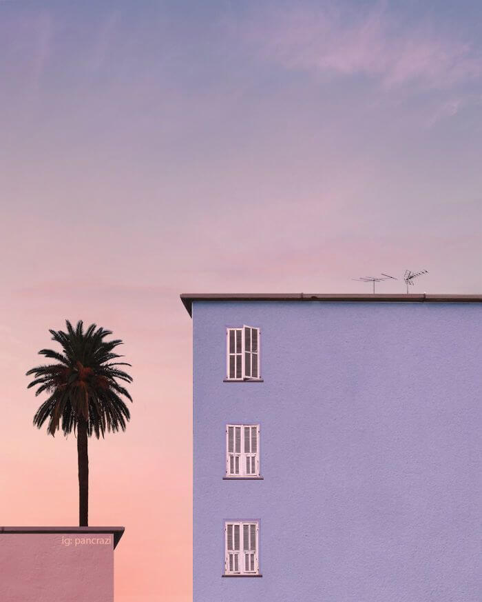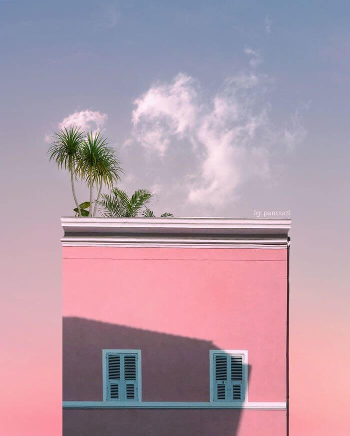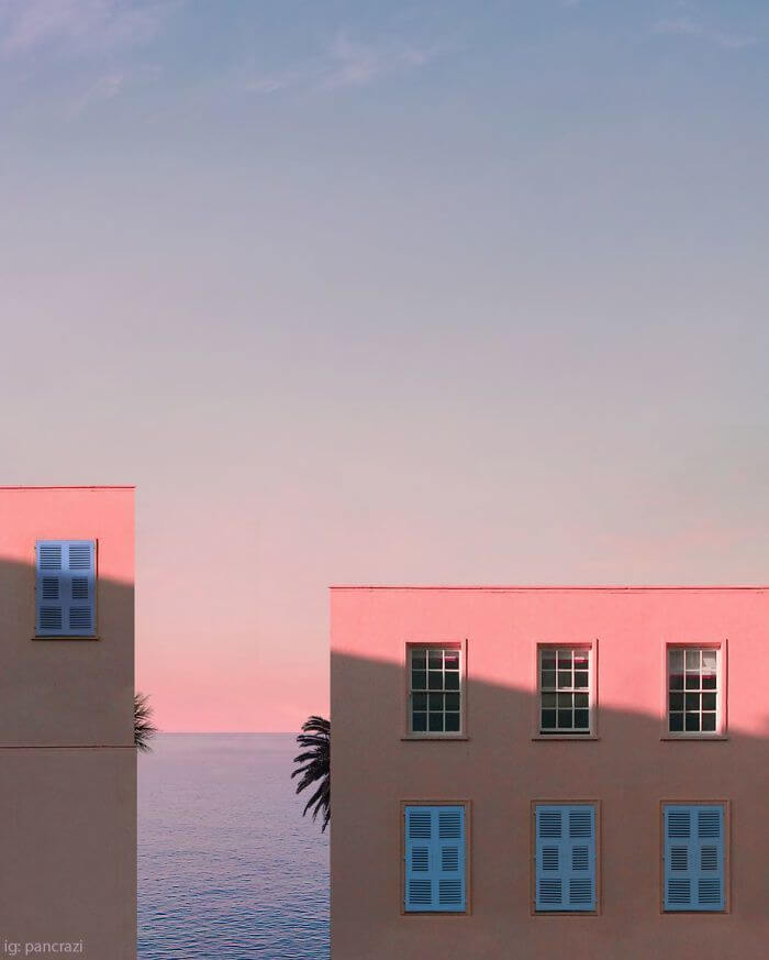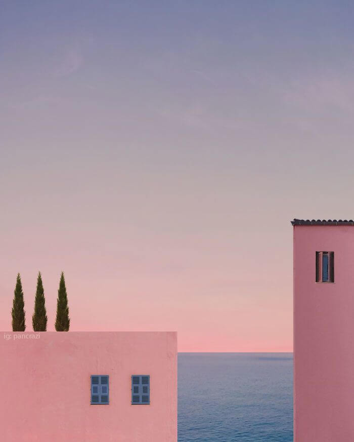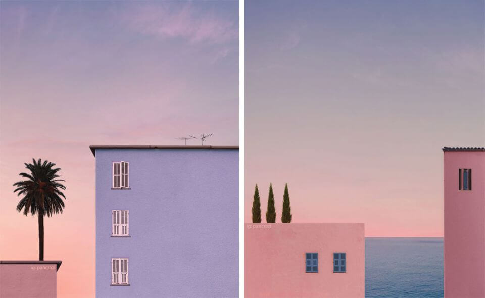 Фотограф Андриа Дариус Панкраси родился и вырос на французском острове Корсика, где на закате небо окрашивается в розовые, фиолетовые и голубые цвета. Сейчас он живет и работает в Лондоне, но каждый раз, приезжая на родину, делает сюрреалистичные снимки побережья, неба и домов пастельных тонов. Фотограф работает в стиле минимализма.