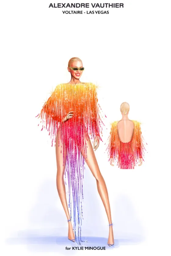 Це був один із трьох образів, створених для виконавиці французьким дизайнером Александром Вотьє. Модельєр також створив асиметричну сукню з бахромою в градієнті кольорів заходу сонця, яку Кайлі одягла того ж вечора. Комбінезон червоного кольору з леопардовою вишивкою й черевиками в тон з’являться на співачці пізніше. Вотьє зазначив, що реалізація сукні з бахромою стала справжнім викликом, адже затребувала понад дві тисячі годин роботи. Для цього шоу Александр створив образи не тільки для Міноуг, але й 141 виріб для акторів другого плану й персоналу.