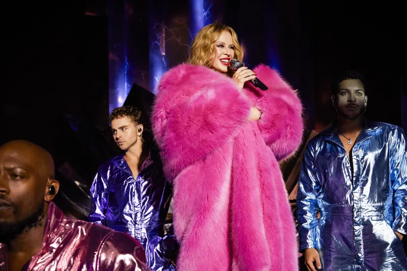 Кайлі Міноуг відкрила своє тримісячне шоу у Лас-Вегасі, нічному клубі The Venetian Voltaire, скинувши велике рожеве пальто зі штучного хутра й оголивши приголомшливий костюм.